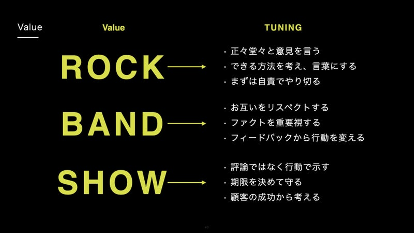ROXXでは、『ROCK』『BAND』『SHOW』という「バリュー(※以下Value)」とValueを具体的な行動ベースに落とし込んだ「チューニング(※以下Tuning)」を掲げています。