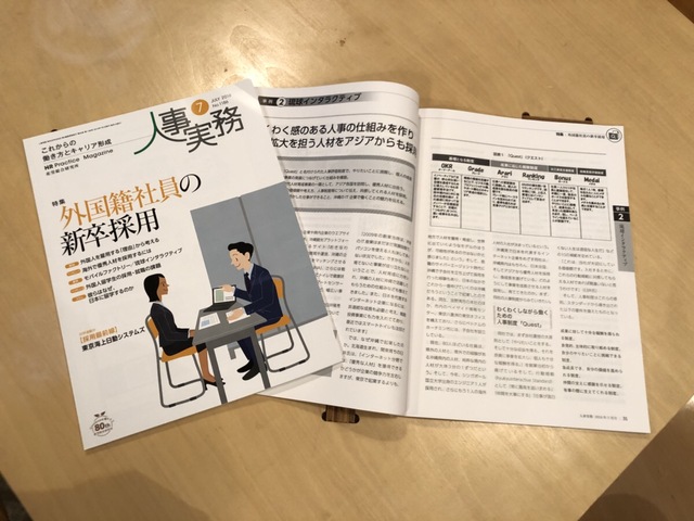 人事・労務に関する専門誌『人事実務』2018年7月号に、当社の人事制度“Quest(クエスト)”をはじめ、外国籍の社員採用や当社の採用方針などについて、代表・臼井およびJOB ANTENNA事業部マネージャーの翁長のインタビューを交えながら、大きく取り上げて戴きました。掲載、有難うございます。