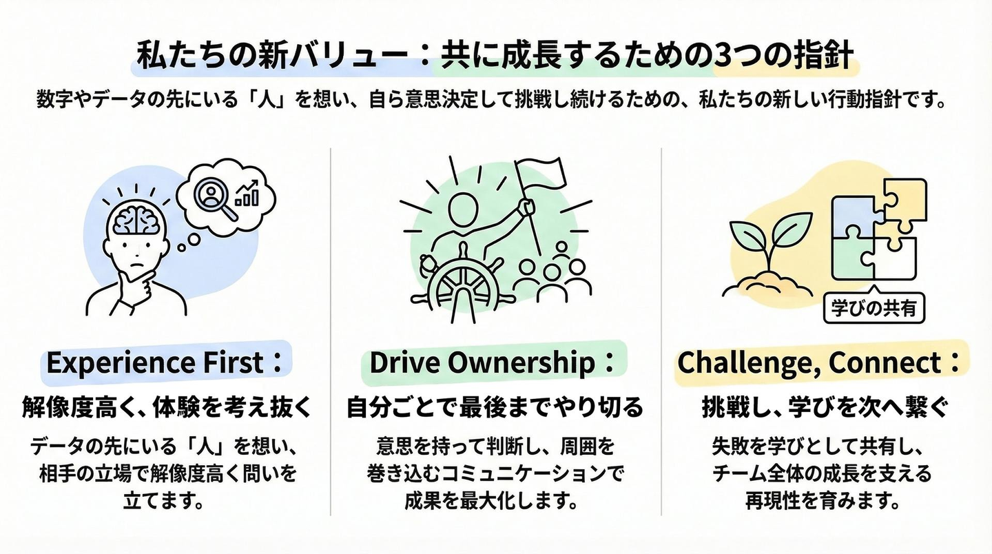 そこで、新しいバリューでは、「Experience First(思考)」「Drive Ownership(実行)」「Challenge, Connect(学習)」という形で、組織の成長サイクルを表すことにしたのです。