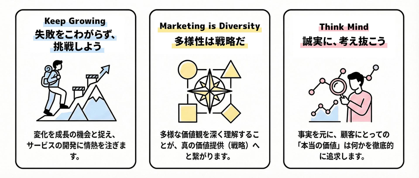 はい。議論を重ねる中で、私たちが最も大切にしている価値観は何かを掘り下げていくと、核にあるのは「徹底的な顧客ファースト」だという結論に至りました。ただ、顧客ファーストを本気で貫くには、きれいな言葉だけでは成立しません。本当に顧客のためになっているのかを深く考え抜くこと、考えたことを実行に移すこと、そして結果から学び続けること。この一連の循環が不可欠だと考えています。