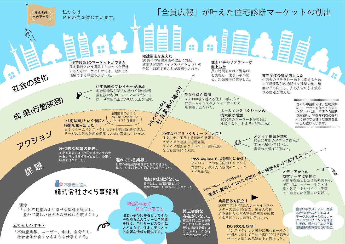 現社長の大西以外、広報・PRのプロがいなかった状況のなか、いかにしてさくら事務所全体で0から広報PRの重要性を、広報・PR素人の社員へ浸透させ、そして現在の「全員広報」を実現させたのか。社員を巻き込み、そして皆が広報・PRをジブンゴト化していく一部始終について、広報・PR担当社員”ではない”証言を元にご覧ください。