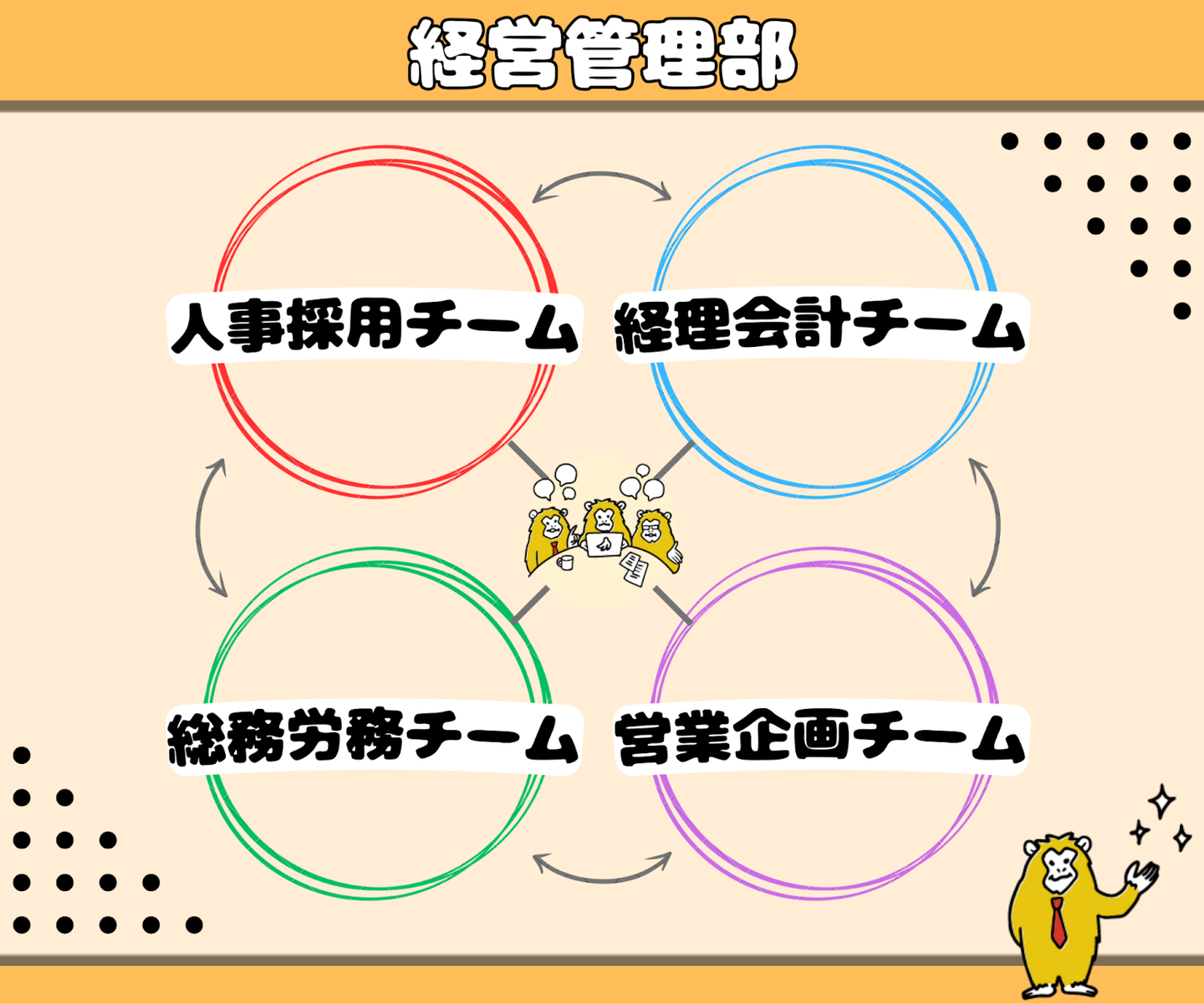 経理会計、人事採用、総務労務、営業企画の4つのチームに分かれています。