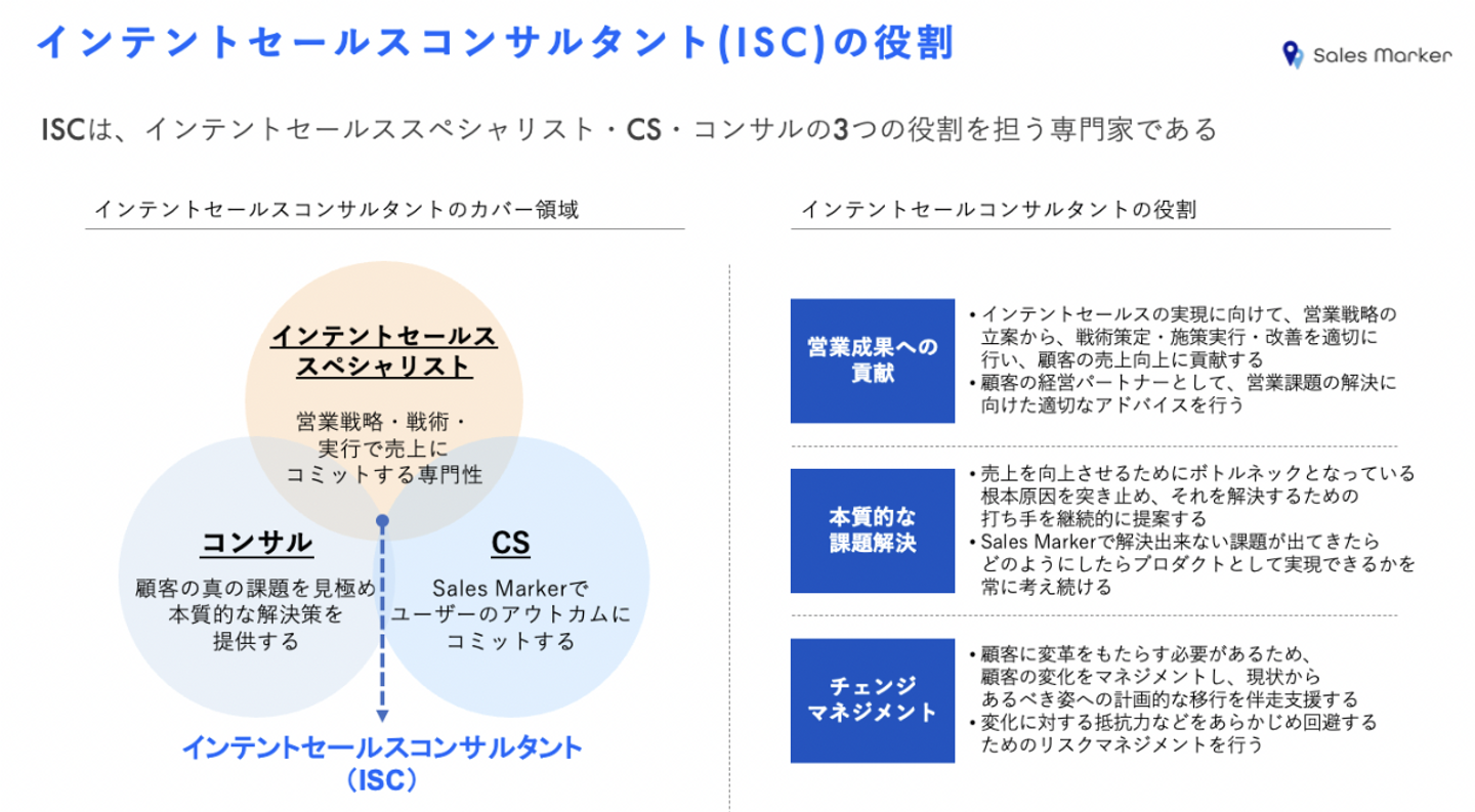 ISCとはインテントセールスを用いて、顧客に継続的な成果を創出する役割をもつコンサルタントです。