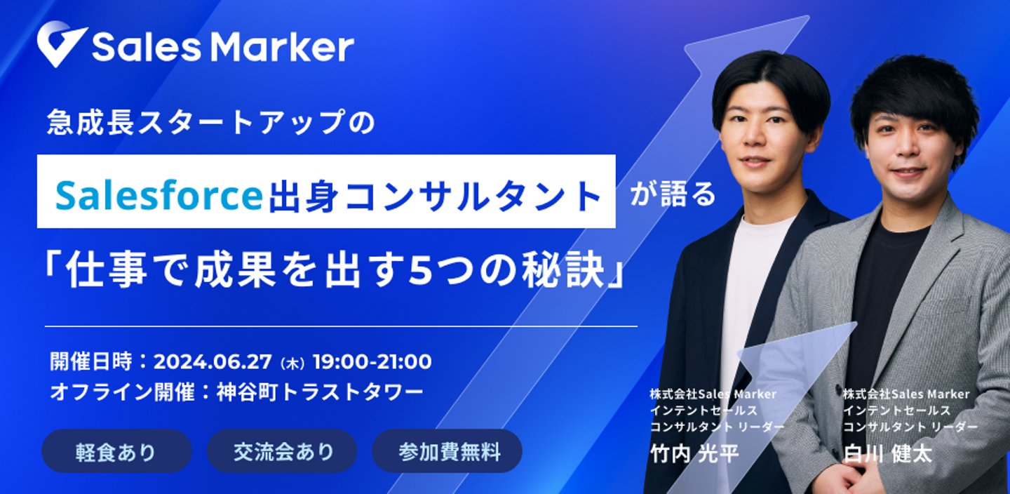 元Salesforceで現在はSales Markerにてインテントセールスコンサルタント*として活躍中の2名が、急成長スタートアップ*という流動的な組織の中で、成果を出すためのコツやスタンスについて語る、どなたでも参加可能な交流型カジュアルイベントを開催します。