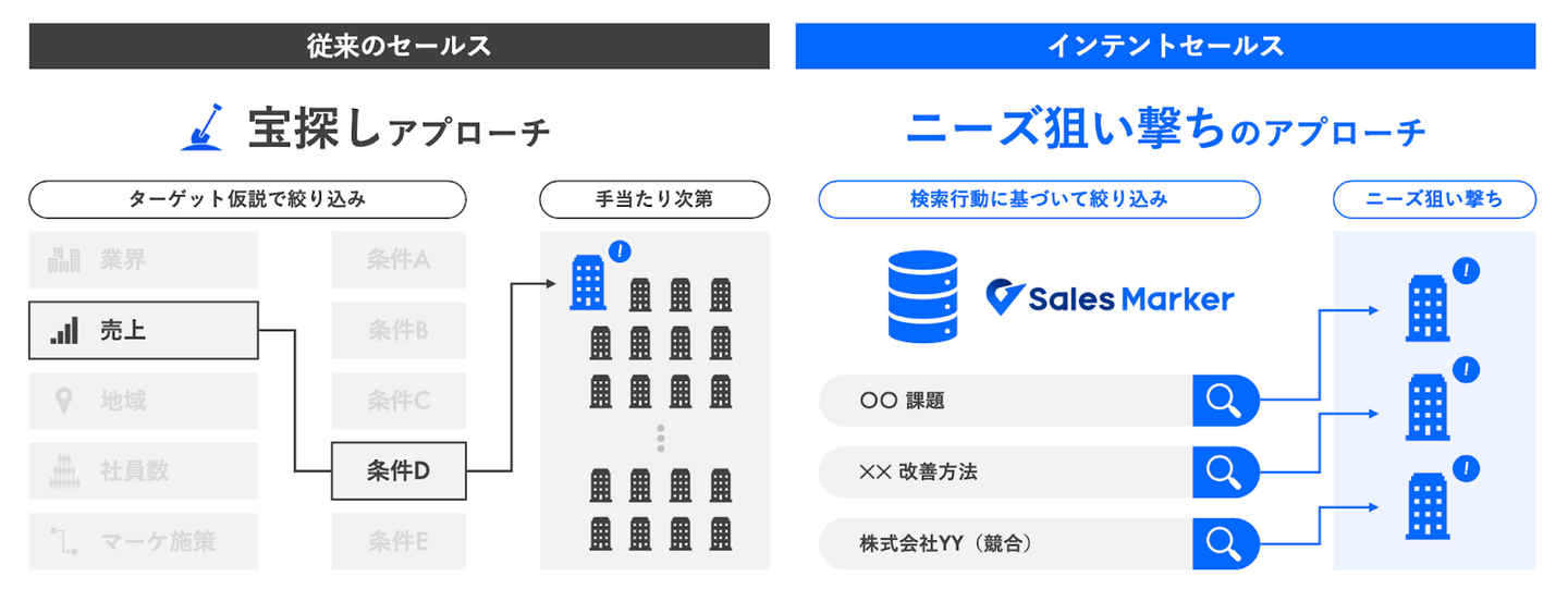 従来の営業活動において、ターゲット企業の特定は大きな課題となっています。多くの営業パーソンは、業界、企業規模、地域などの基本的な属性情報をもとにターゲットリストを作成しますが、これらの情報だけでは、実際にサービスや製品に興味を持っている企業、すなわち「ニーズがあるターゲット」を見つけることは困難です。このように、「属性データ」に基づいた営業手法では、宝探しのように手当たり次第アプローチするしかありません。