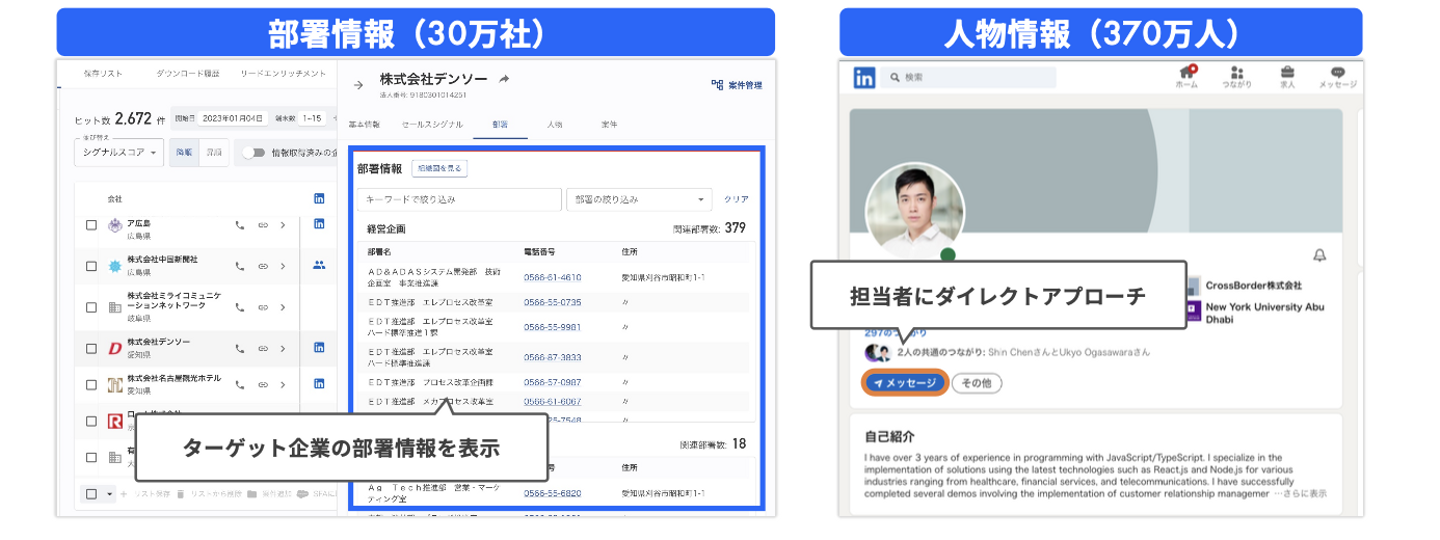 「Sales Marker」は、日本最大級の人物データベース(370万件)と企業データ(500万件)を組み合わせることで、アプローチすべき部署・人物などを特定します。![]()