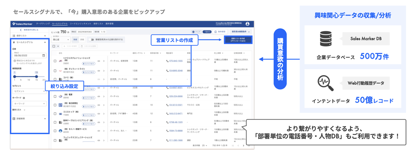 「Sales Marker」は、約500万件の企業データベースと企業のWeb検索行動(検索クエリやサイトの閲覧履歴など)のインテントデータを分析することで、自社のサービスや製品に興味を持っている企業を特定します。