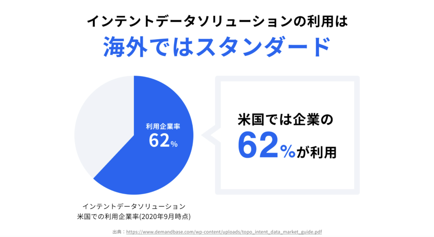 インテントデータはアメリカでの認知度や利用率は高く、2020年9月に行われたTOPO(カリフォルニアのリサーチ&アドバイザリーファーム、現Gartner)の調査によると、すでに62%の企業がインテントデータの有効性を認めて、一つ以上のインテントデータソリューションを利用しているという結果が出ています。