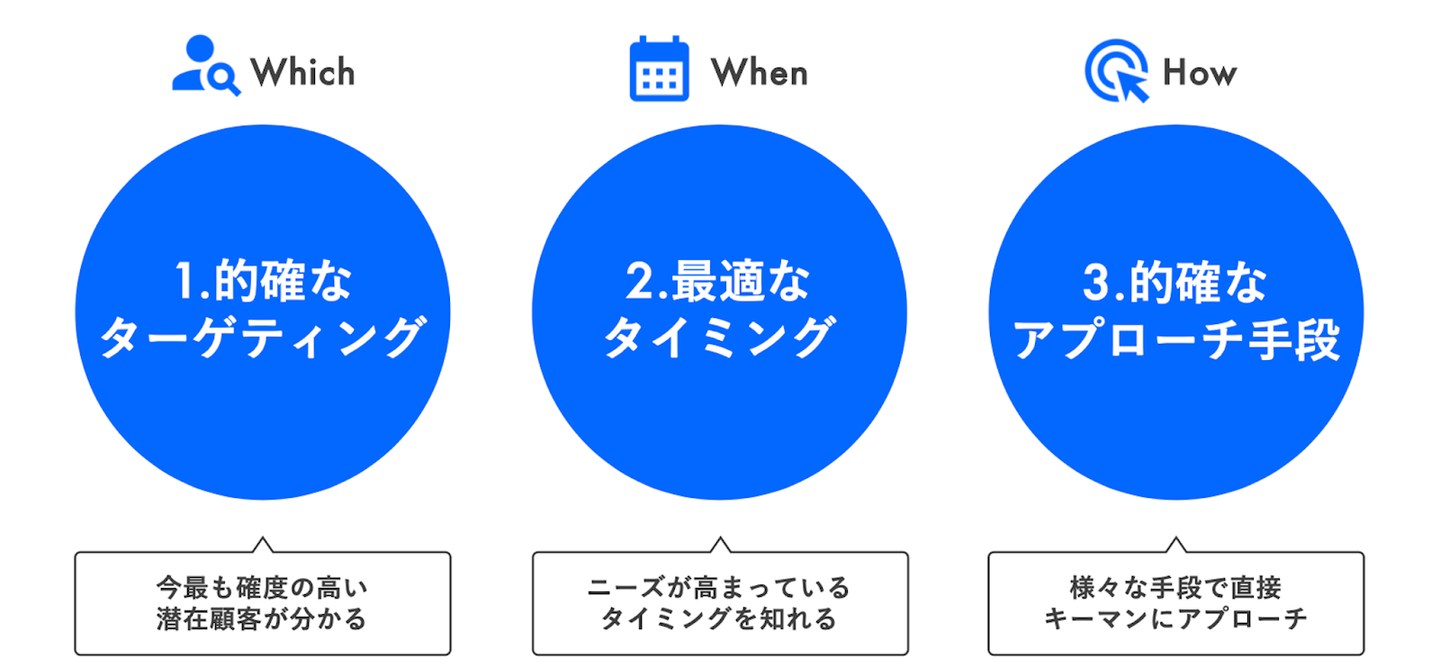 例えば、「〇〇社が「顧客管理ツール」とWeb検索している!」「〇〇社が製品比較サイトで自社サービスと類似サービスを閲覧している!」といったような情報を把握し、適切なアプローチを行うことができます。