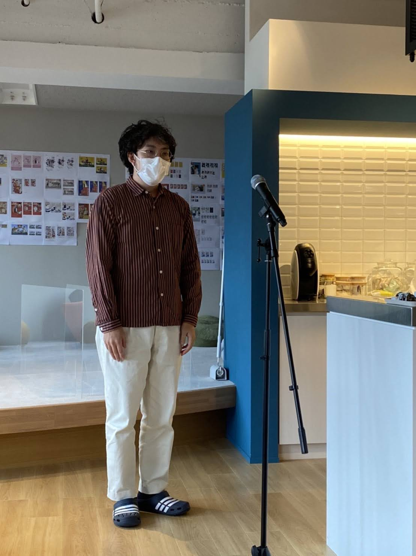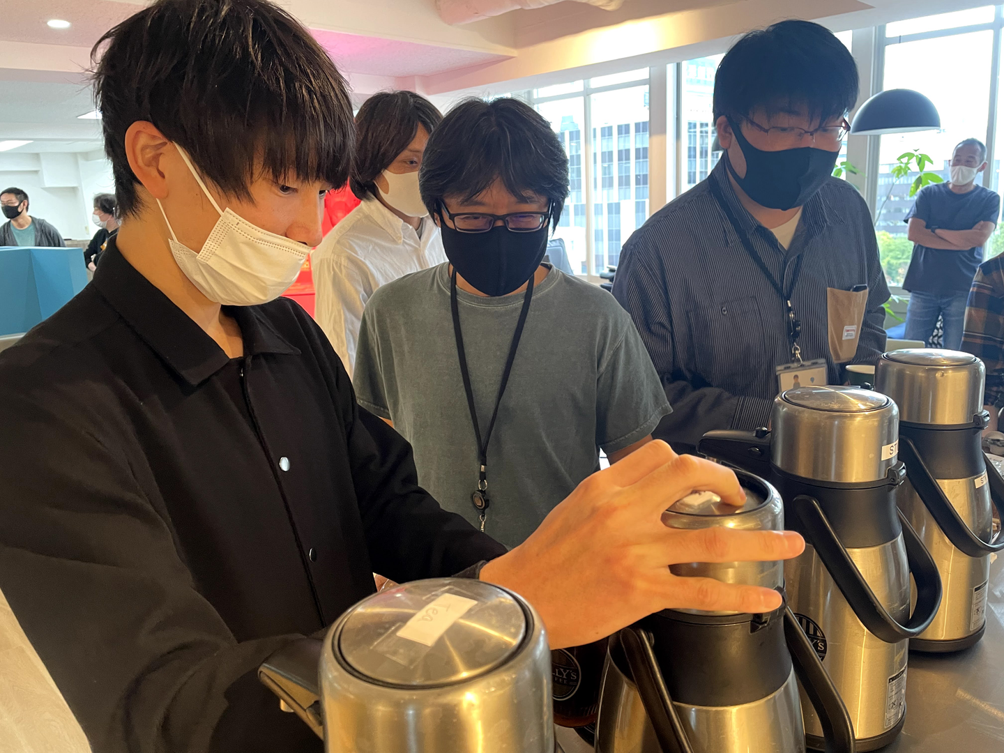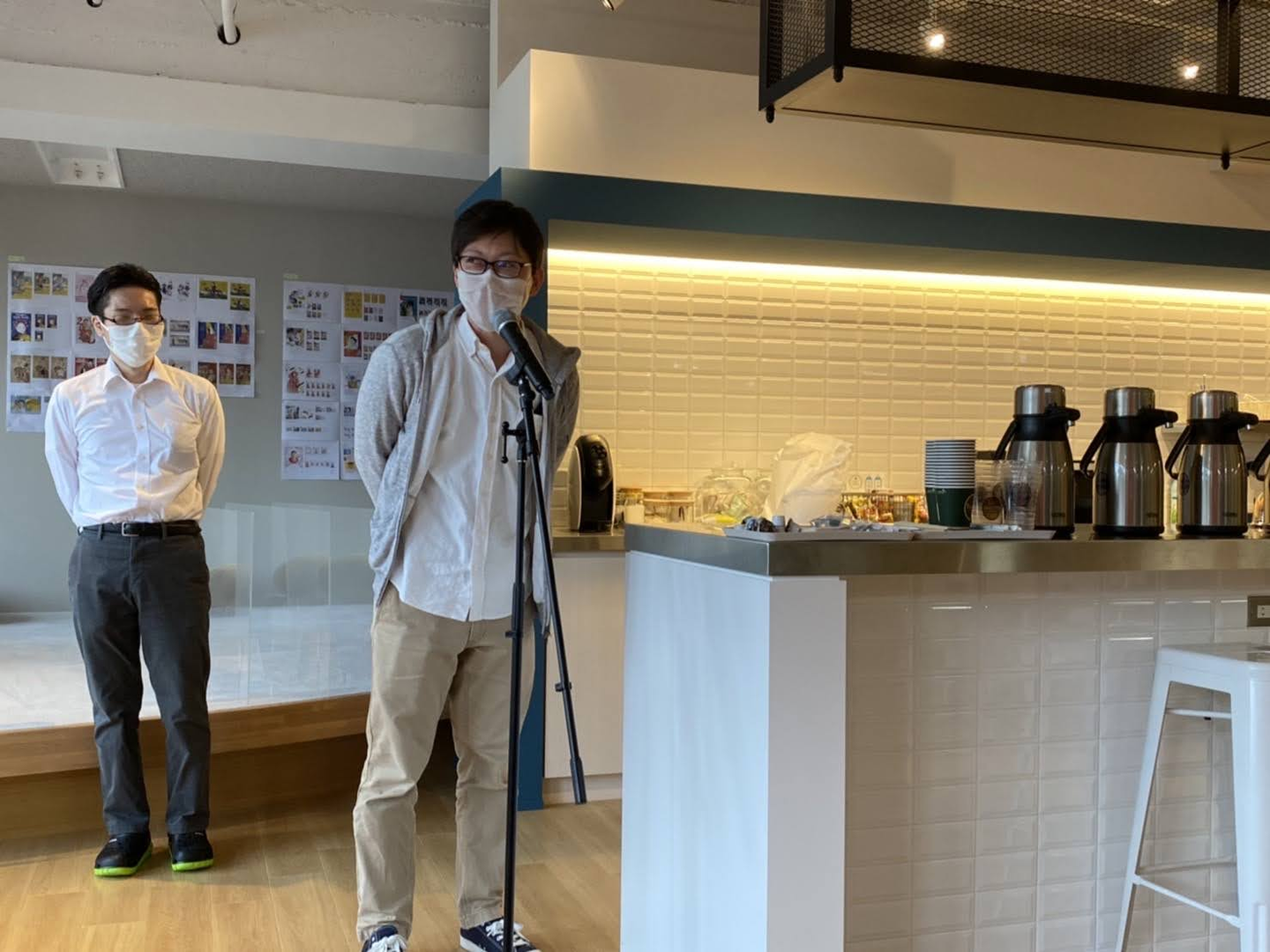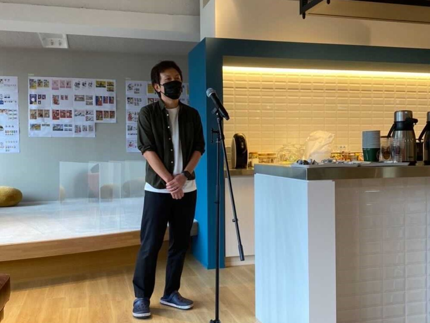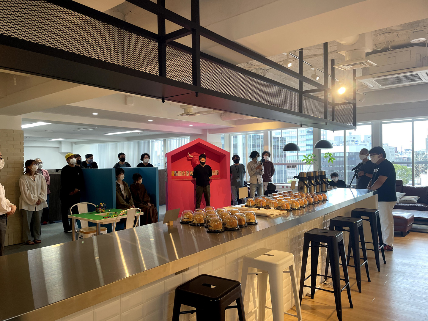 事前に周知された時間に、出社していたスタッフはカフェスペース前に、リモート組もZoomで続々と集まってきました。