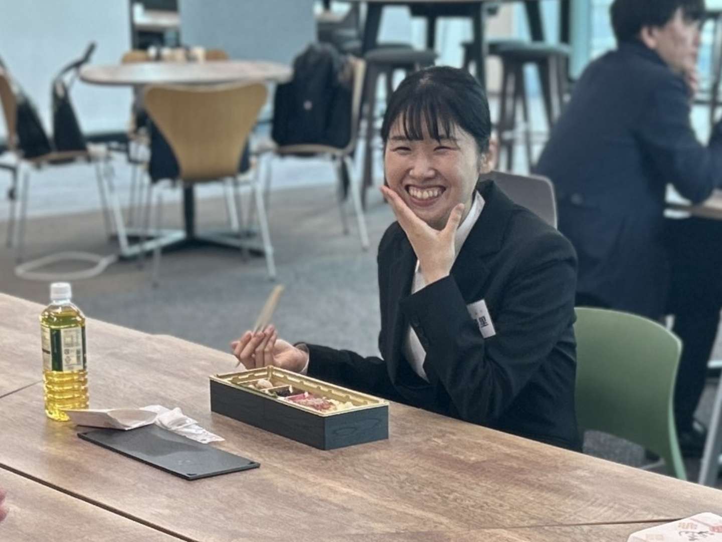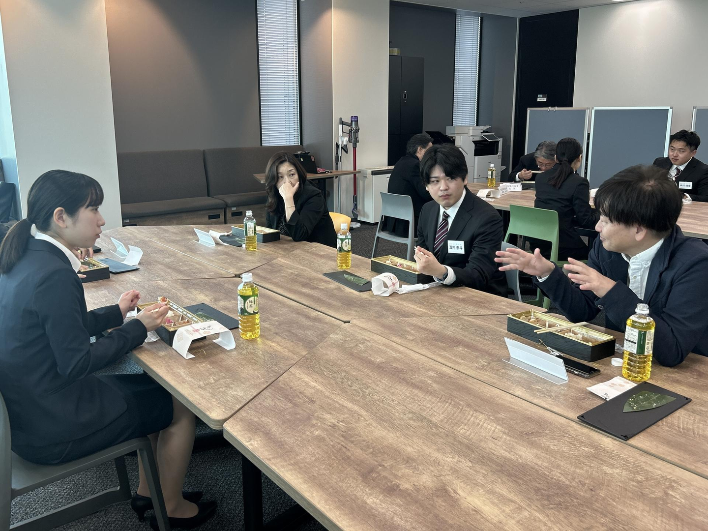 入社式の後は役員とランチです。会場のテーブルをレイアウトしなおして、おいしいお弁当を頂きました。