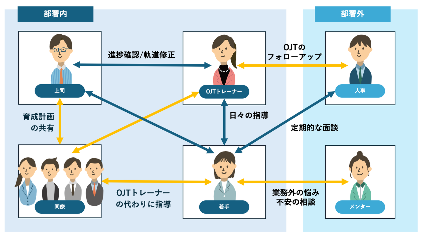これまでOJTトレーナーと若手が1対1で向き合ってきましたが、今後は上司や同じ部署の仲間たちも育成に関わり、若手をチーム全体で育てる体制に変わりました。