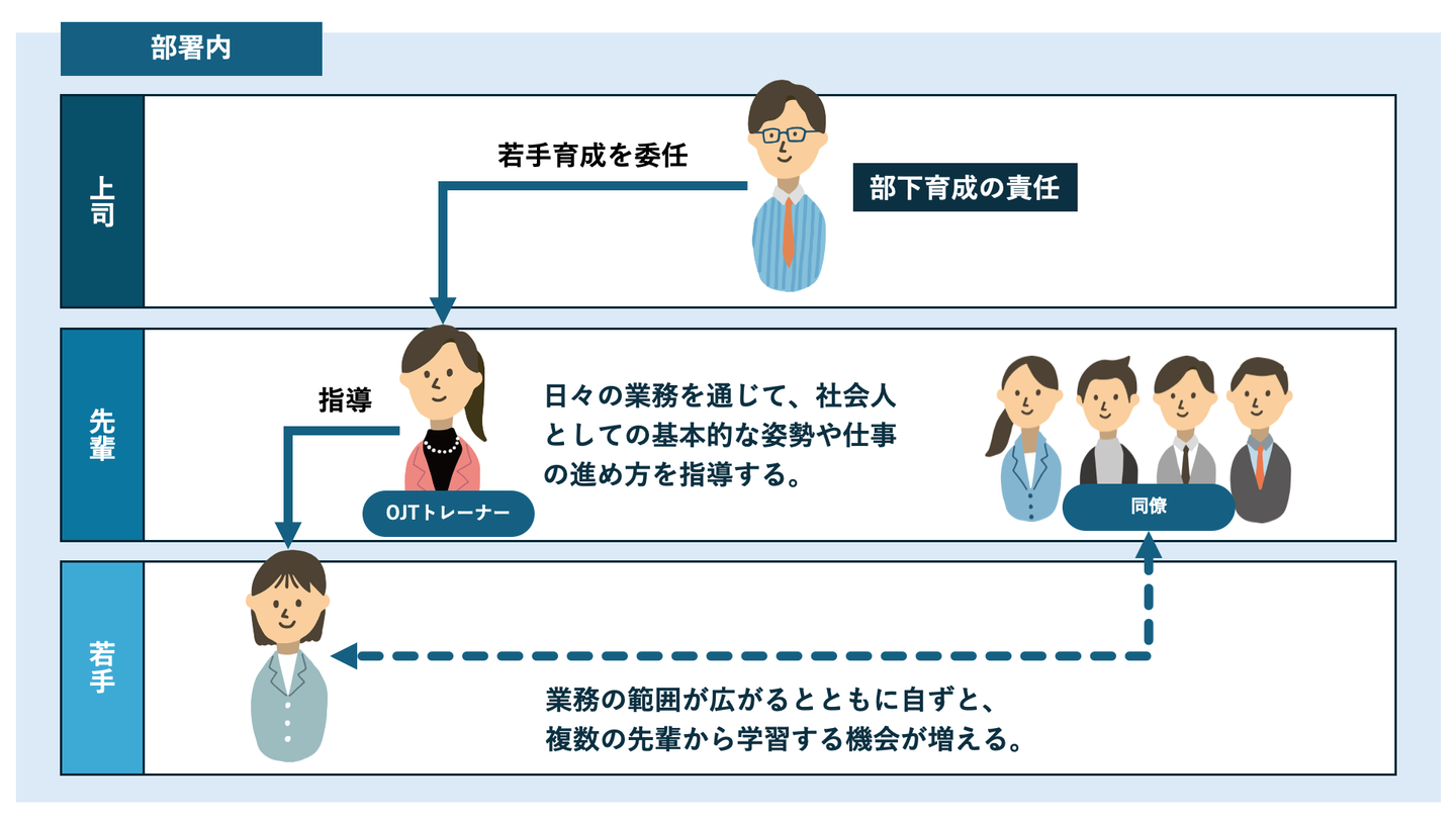 このやり方には、若手の性格や理解度に応じて柔軟なサポートができる、先輩との信頼関係を築きやすいなどのメリットがあります。
