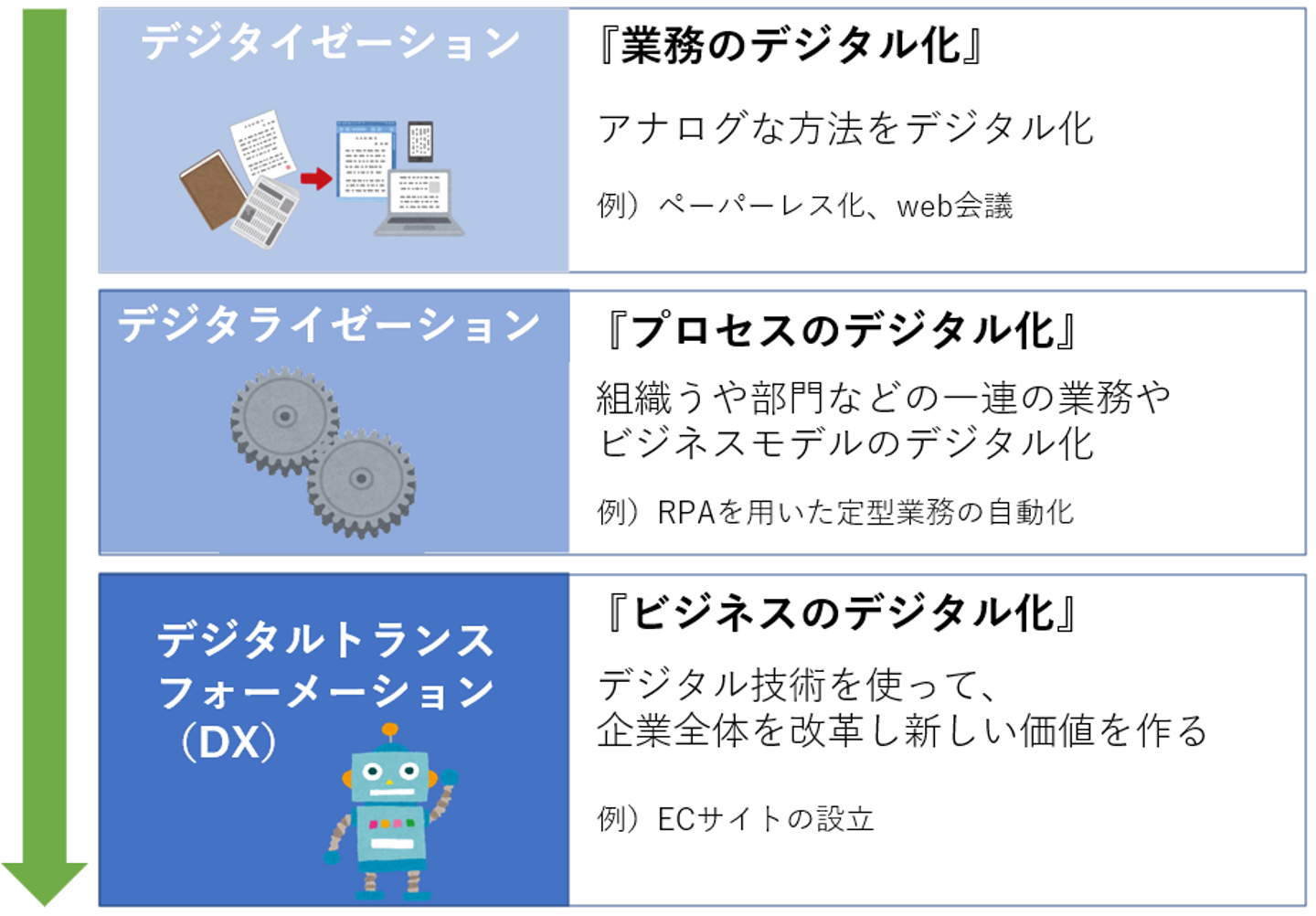 - 『デジタイゼーション・IT化< デジタライゼーション< DX』という順番に上位化された考えである。