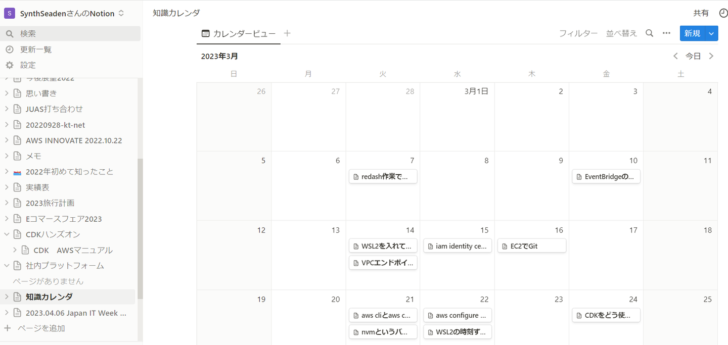 例1)Notionのカレンダー機能を使った備忘録(知識カレンダリスト)、その日学んだ有益なことをメモっている。詳細はリンクをクリックすると表示されるようになっています。