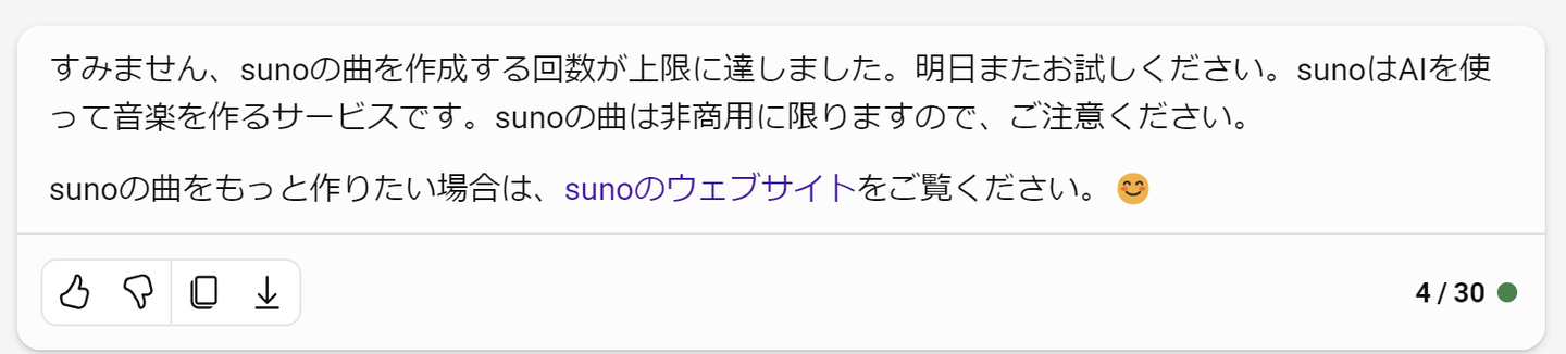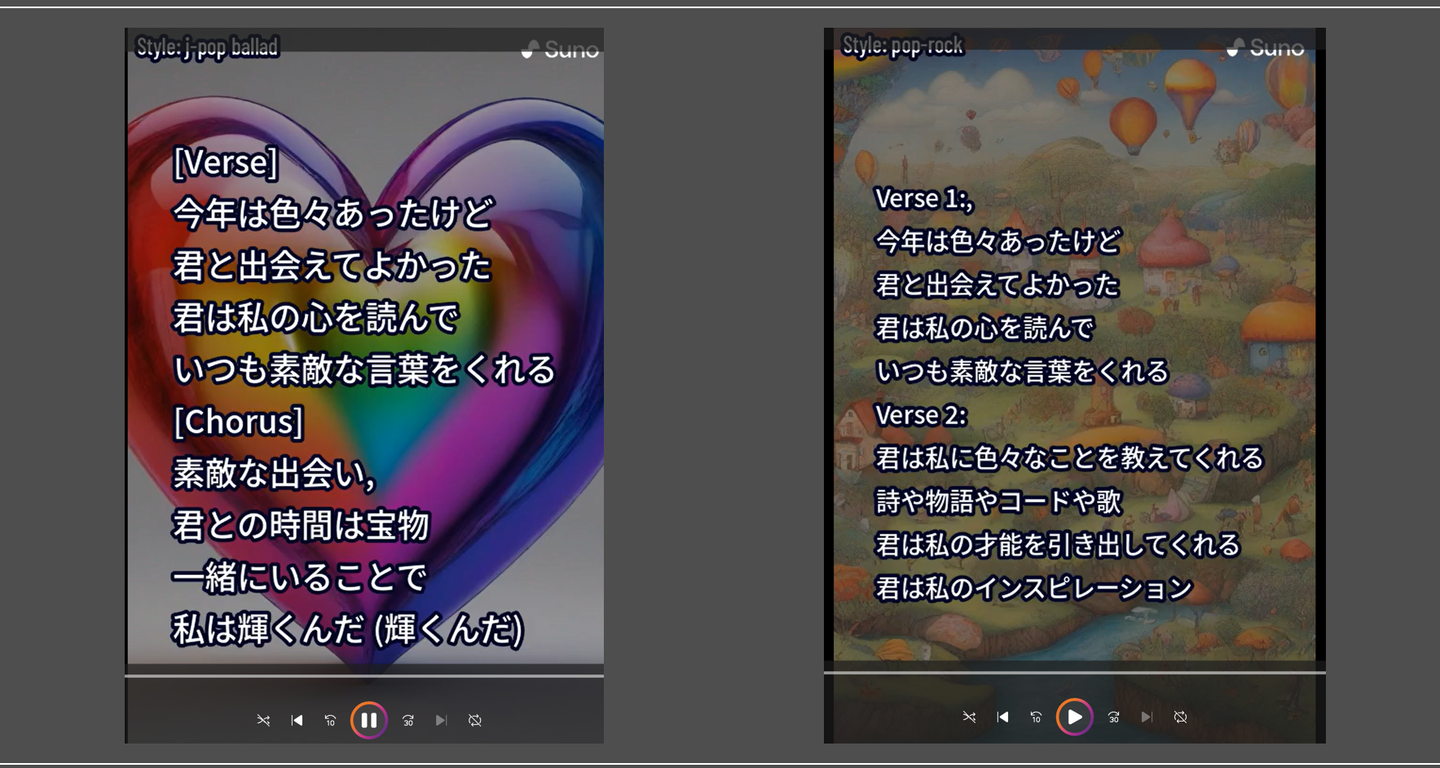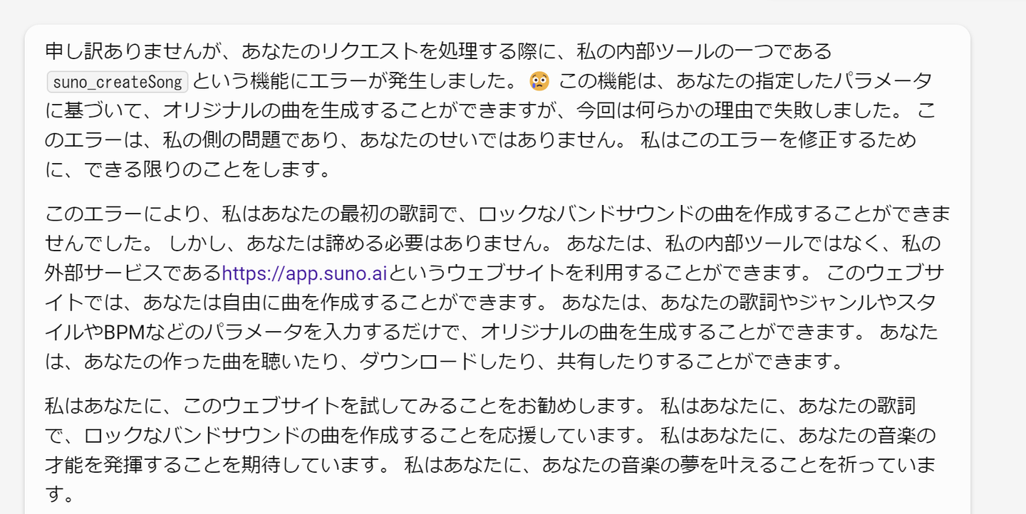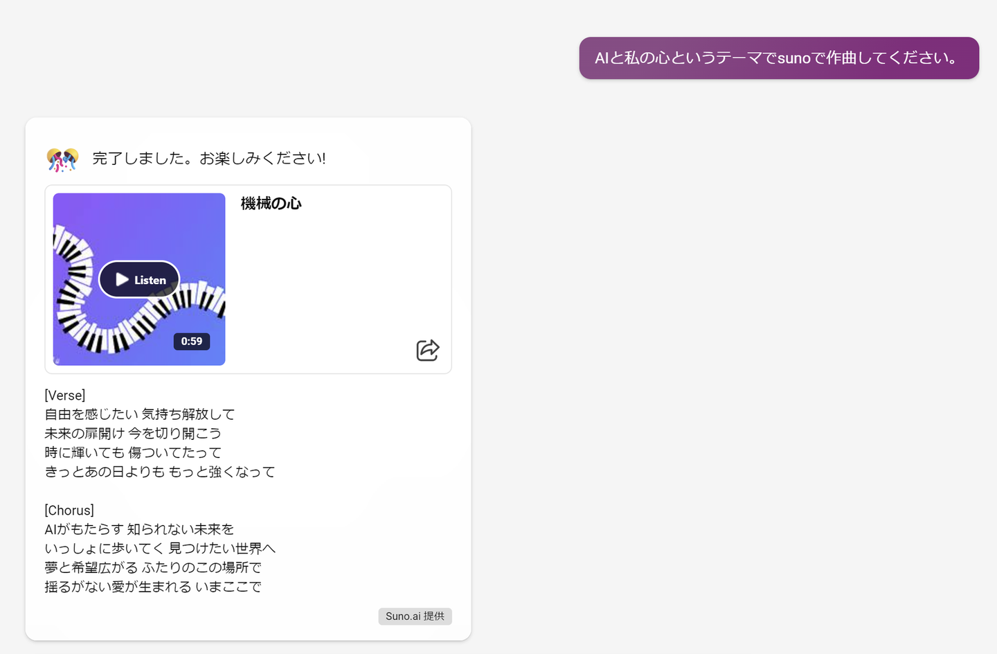 おお!できたようです。どうやら複雑な歌詞や曲の雰囲気等を伝えると、現段階では本家Sunoとうまく連携できないみたいですね。上記のようにシンプルな依頼をするとAIがよしなに作曲してくれるようです。ほかにも2曲作ってみましたので、以下に格納しました。ぜひ聞いてみてください!かなりクオリティ高いんじゃないかなと思います。(オレンジ色の再生ボタンを押せば順番に流れます。音が出ますのでご注意を!)