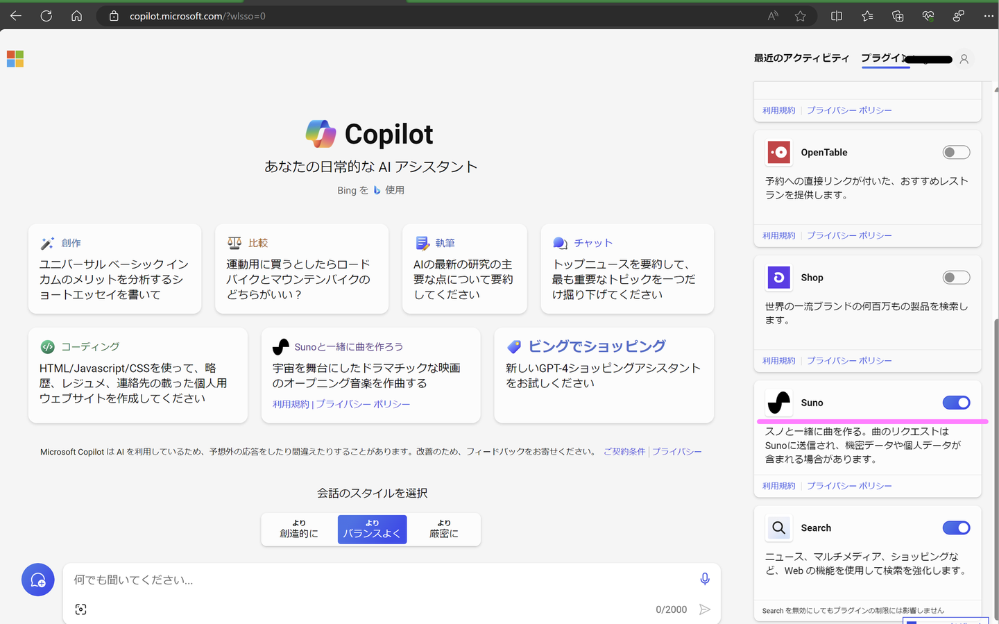 自動作曲生成AI「Suno」、Copilotのプラグインとして利用可能に!