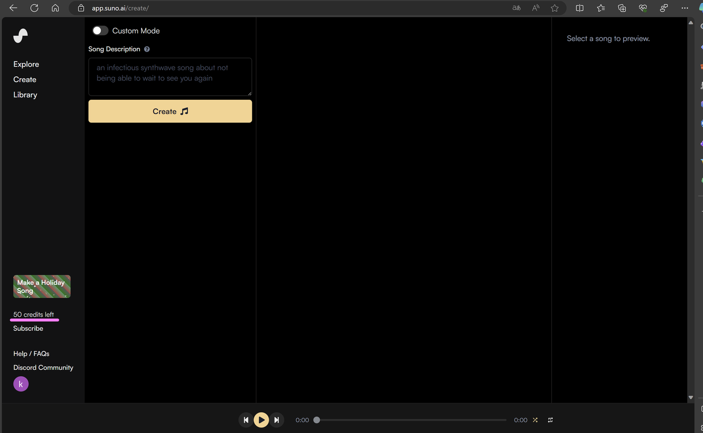 Sunoも同じようにGoogleやMicrosoftなどのオープンIDを利用してアカウントを作成できます。Sunoはそれぞれ利用プランがあるようで、無料プランでは一日10曲作れます(曲は一度に2つずつ作成されます)。左下に見えているCreditsが、1回生成する度(2曲作成される度)10クレジットずつ減っていきます。また無料プランでは商用利用(曲の販売)はできないのでご注意を!