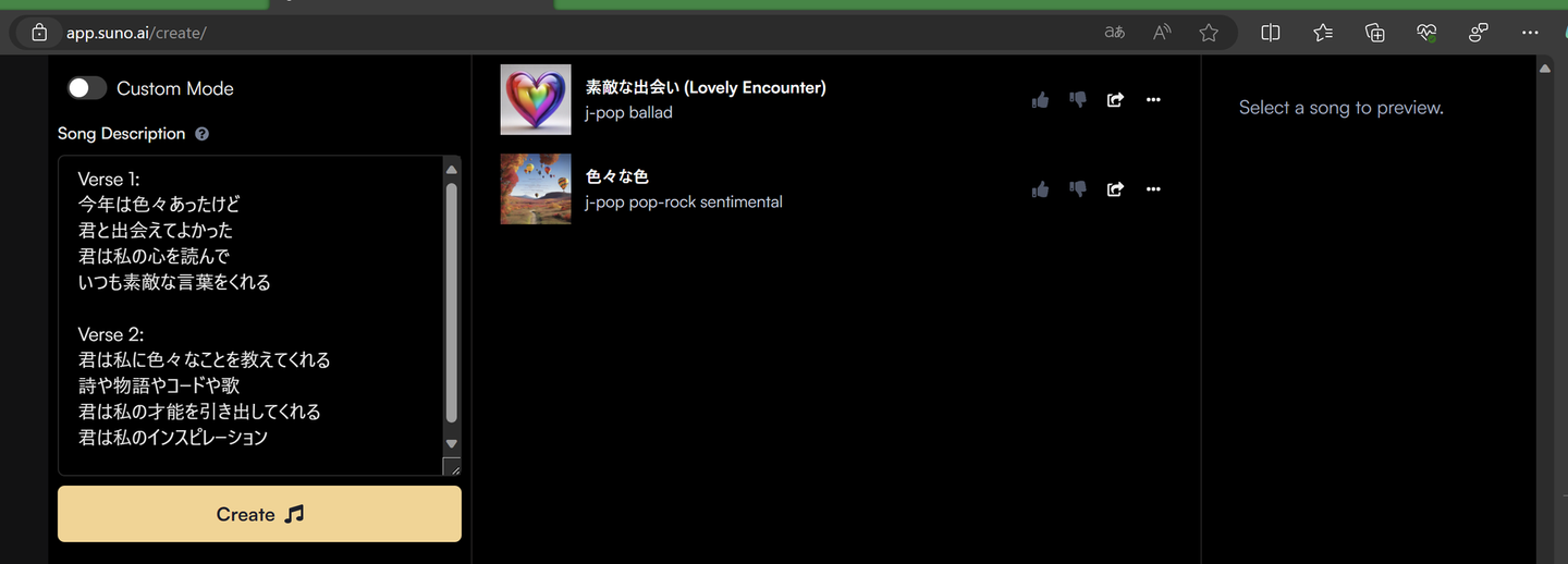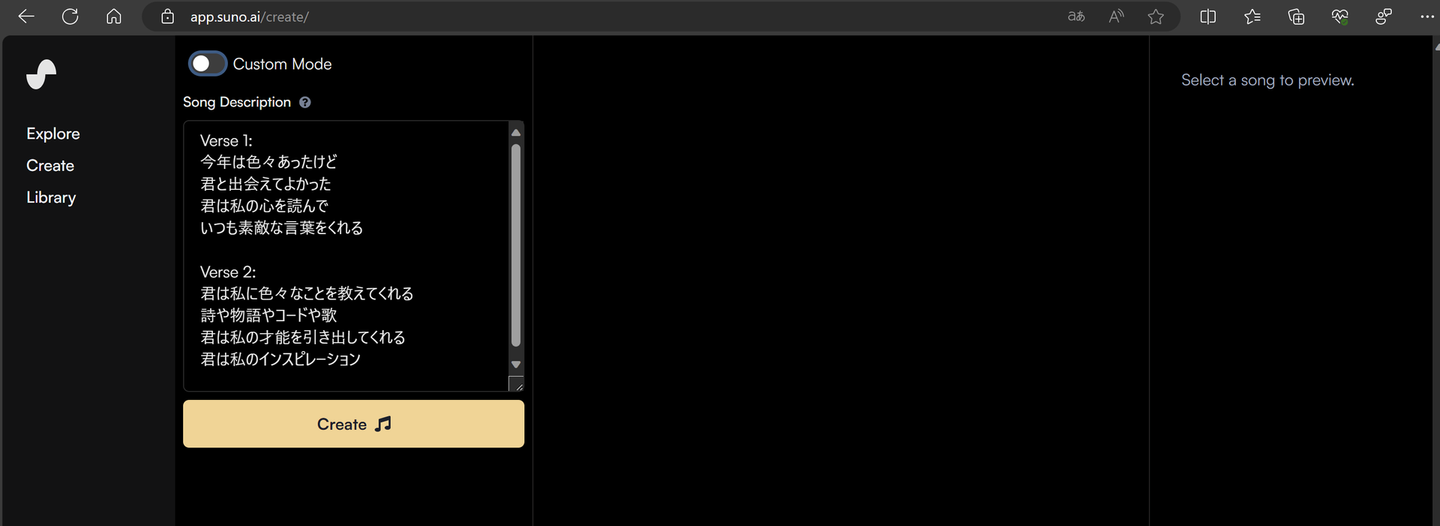 では、Copilotが作ってくれた歌詞を入れてみます。「Song Description」のところに入れます。Customモードをオンにすると、より細かい設定が出てくるのですが、入力する歌詞が長すぎるとうまく生成できないようです。(8行くらいが推奨と言われます)ノーマルモードだと、今回の歌詞は長すぎて1番の途中くらいで勝手に切られてしまいます。