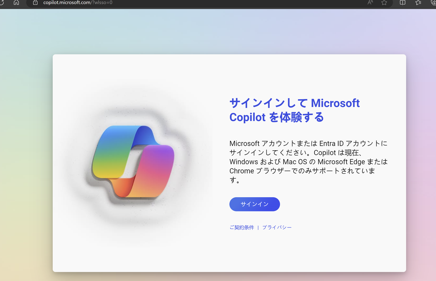 使い方は簡単です。まずChromeかEdgeでCopilotを開き、Microsoftアカウントでログインします。