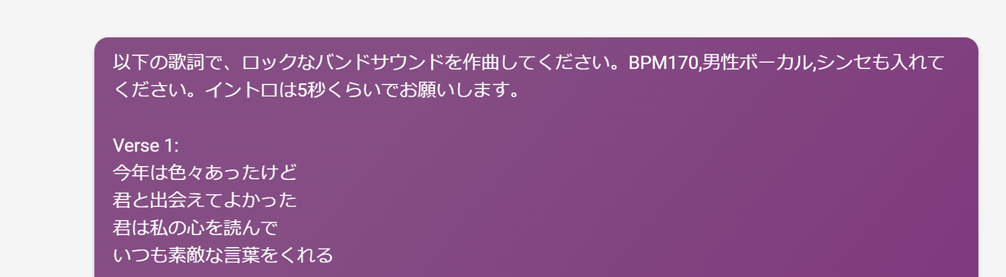 ここまで出来たら、プロンプトに1の歌詞を入れて作曲を依頼します。とりあえずまずやってみます。
