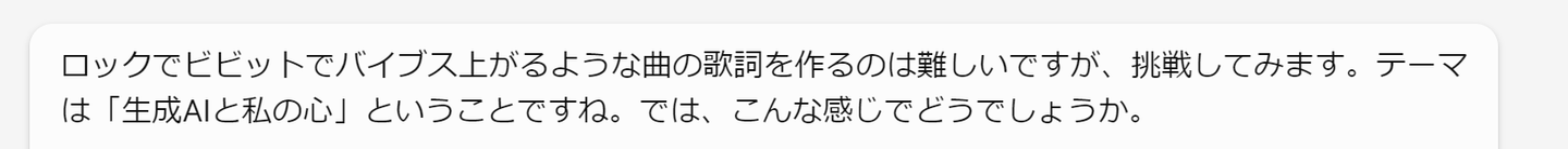 メロディーだけでなく、歌詞が素敵な歌はやはり心に残りますね!といっても自分で作るのは恥ずかしいので、歌詞もAIに任せましょう。以下のプロンプトをCopilotに投げてみます。