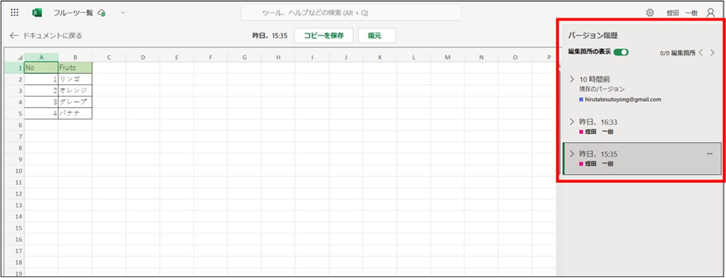 「変更箇所の表示」の隣の「バージョン履歴」を押下すると以下のような画面に遷移できます。復元も可能です。