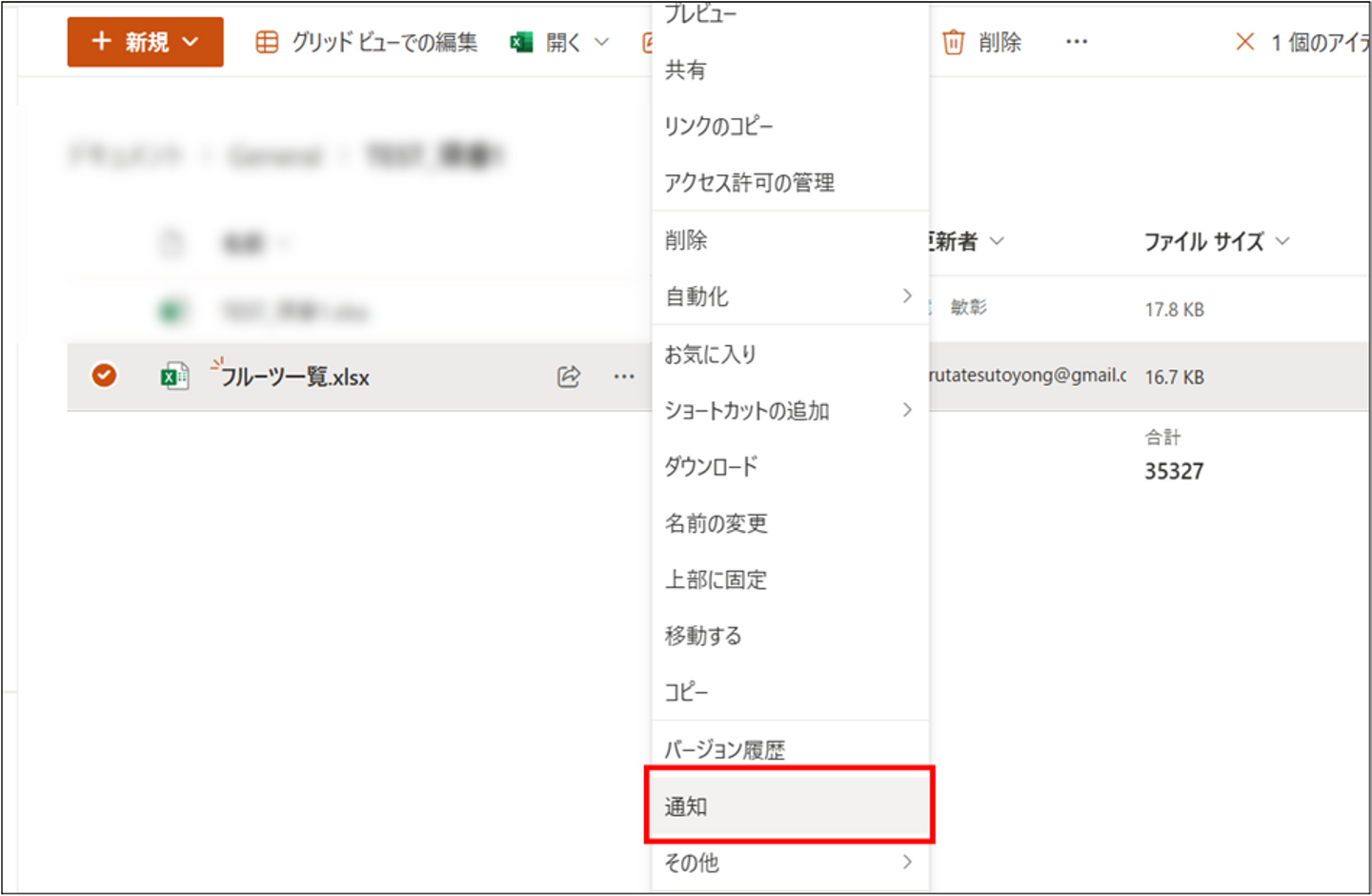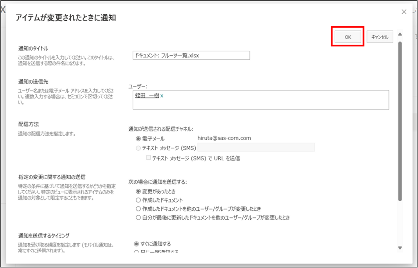 通知先を自分に設定し、配信方法を電子メール、アイテム(ファイル)に変更があったときに連絡が来る設定にしたら、「OK」を押下します。