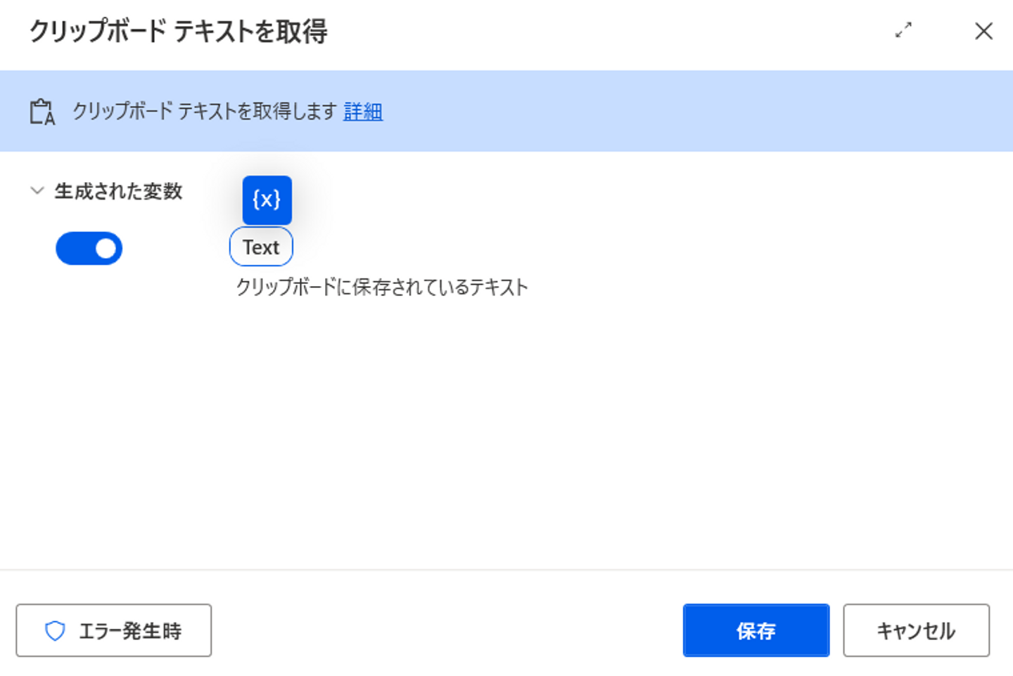 ⑤「クリップボードテキストを取得」よりコピーしたテキスト内の文章を変数に保存しておきます。