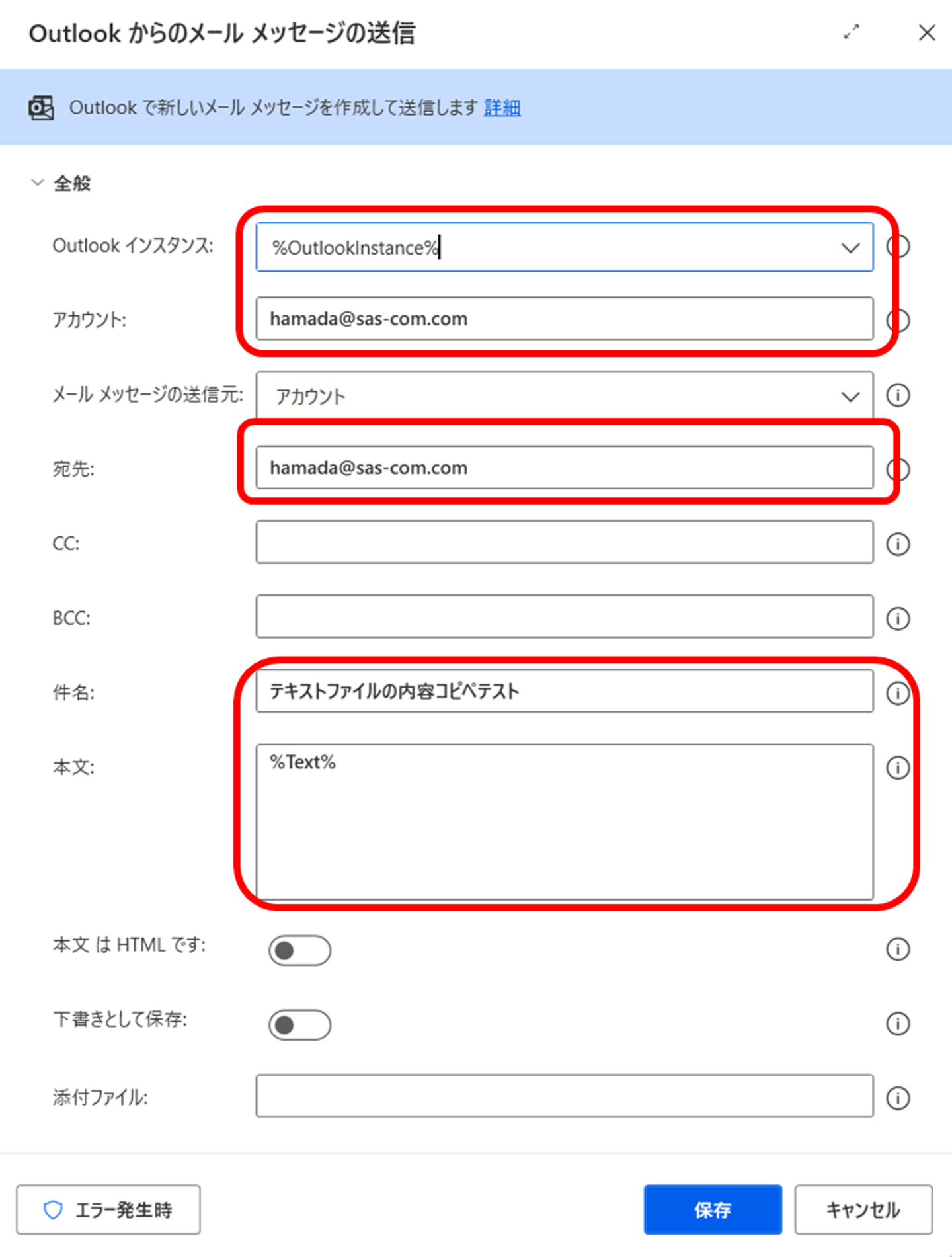 ⑥「Outlookを起動します」よりOutlookを立ち上げ、「Outlookからのメールメッセージの送信」より下記を設定し、フロー構築は完了となります!