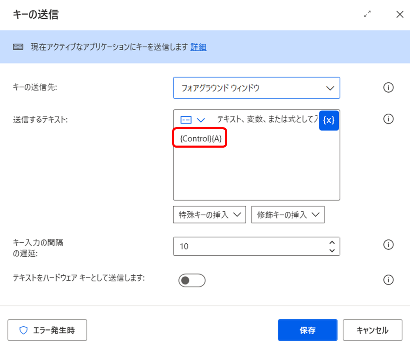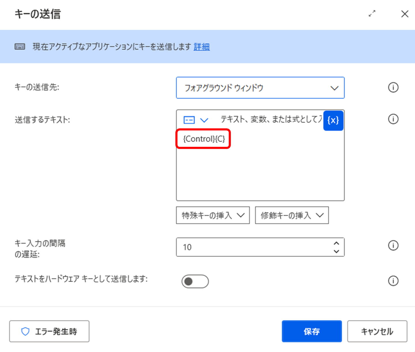 ④再度「キーの送信」で「{Control}{C}」を記載します。