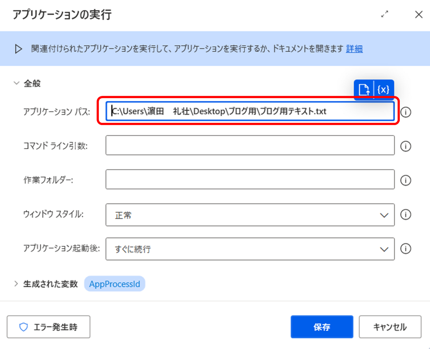 「アプリケーションパス」に今回テキストを置いたパスを指定します。