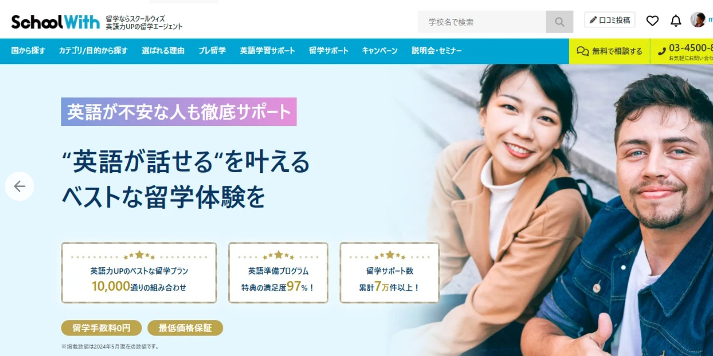 コロナ禍を経てリブランディングを実施し、私たちは現在、英語力UPの留学エージェントをコンセプトに「School With(スクールウィズ)」を運営しています。