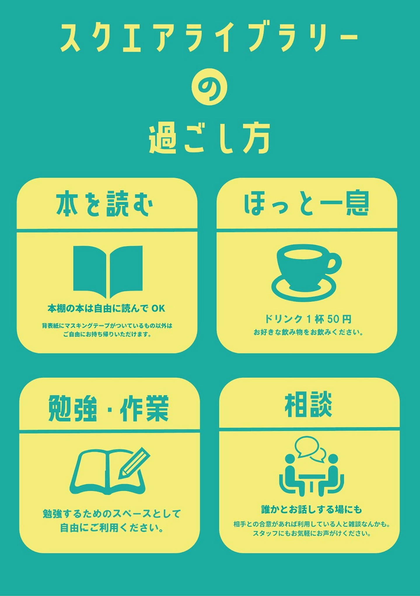 スクエアライブラリーは、本との出会いにとどまらず、人と人がつながり合うあたたかな場です。これからも気軽に立ち寄れる居場所として、本からはじまる新しい出会いとつながりを大切にしていきます。