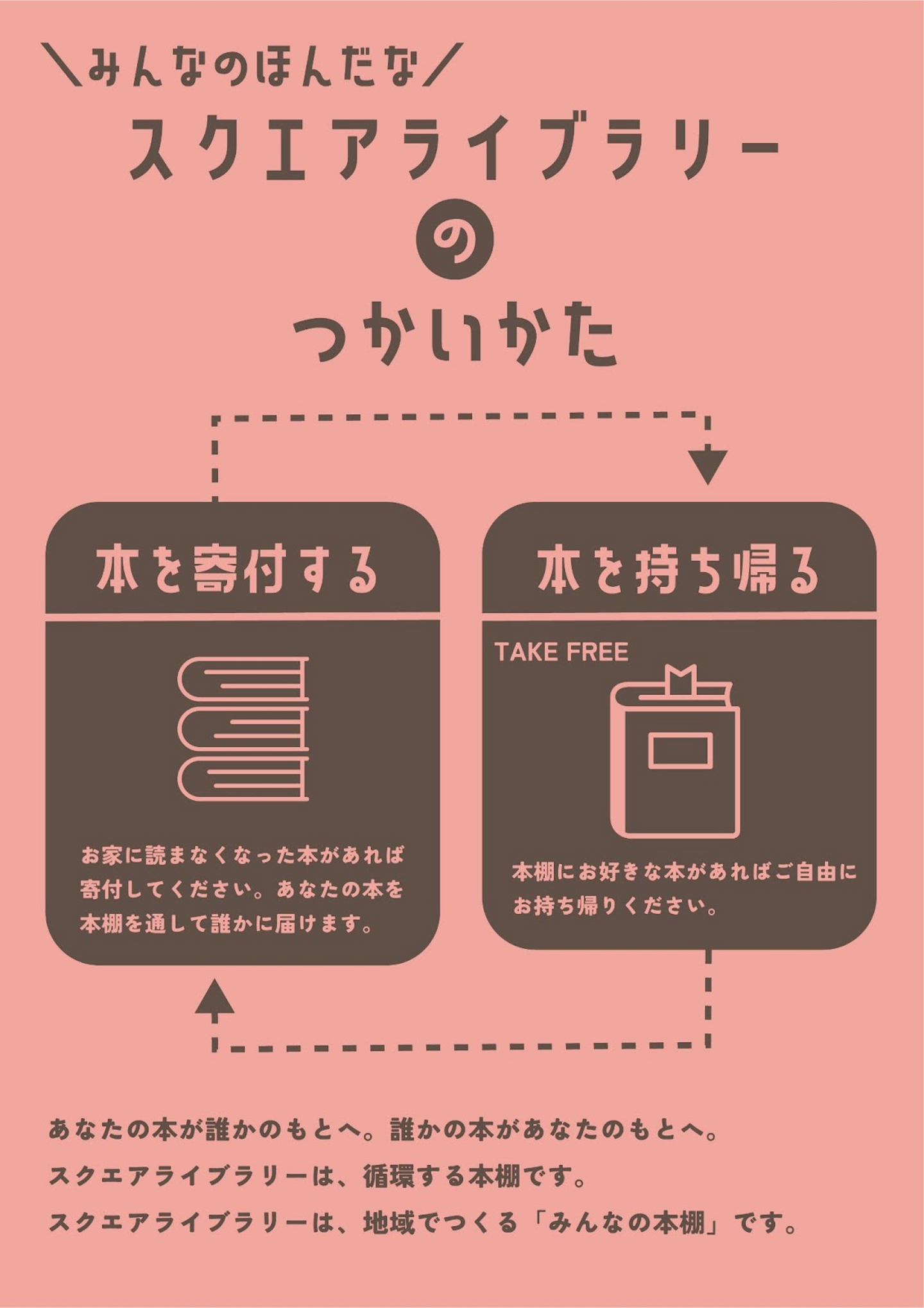 お家に眠っている本を棚に置けば、誰かの手に渡り、また誰かの新しいページがめくられていく。逆に、自分が気になった本を見つけたら、自由に持ち帰ることもできます。