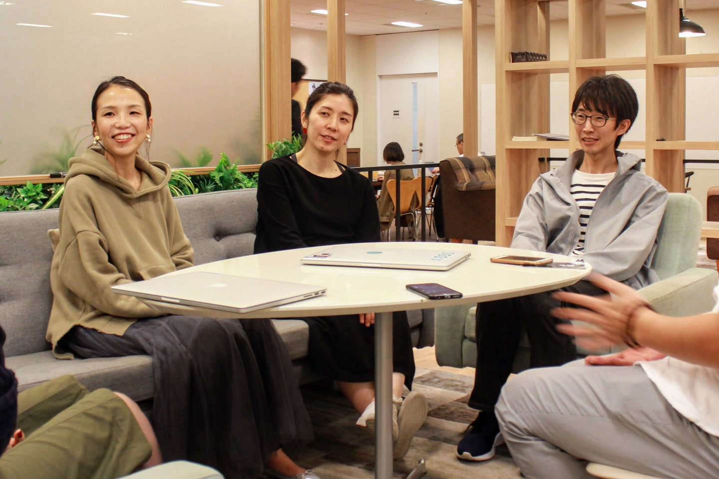 比企 真知子(写真中央) : x:eeeのデザイナーとして、主にプロダクトのUIデザインを担当。