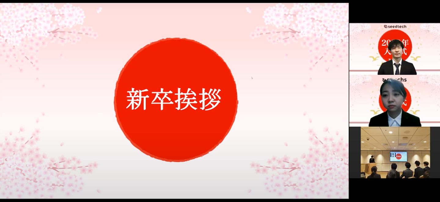 ※ 今回の入社式はオフラインとオンラインでの参加・視聴を併用した「ハイブリッド形式」で開催、シードテック代表の高原は日本のオフライン会場で参加、新入社員のMoriwakiはフィリピン・セブ島からオンラインで参加しました。