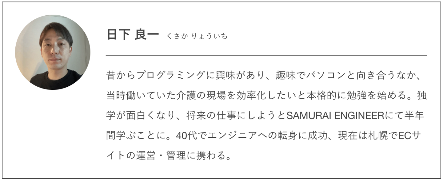 40代、プログラミング未経験からSAMURAI ENGINEERで半年間学び、見事札幌の地でエンジニアデビューを果たした日下さんにお話を聞きました。