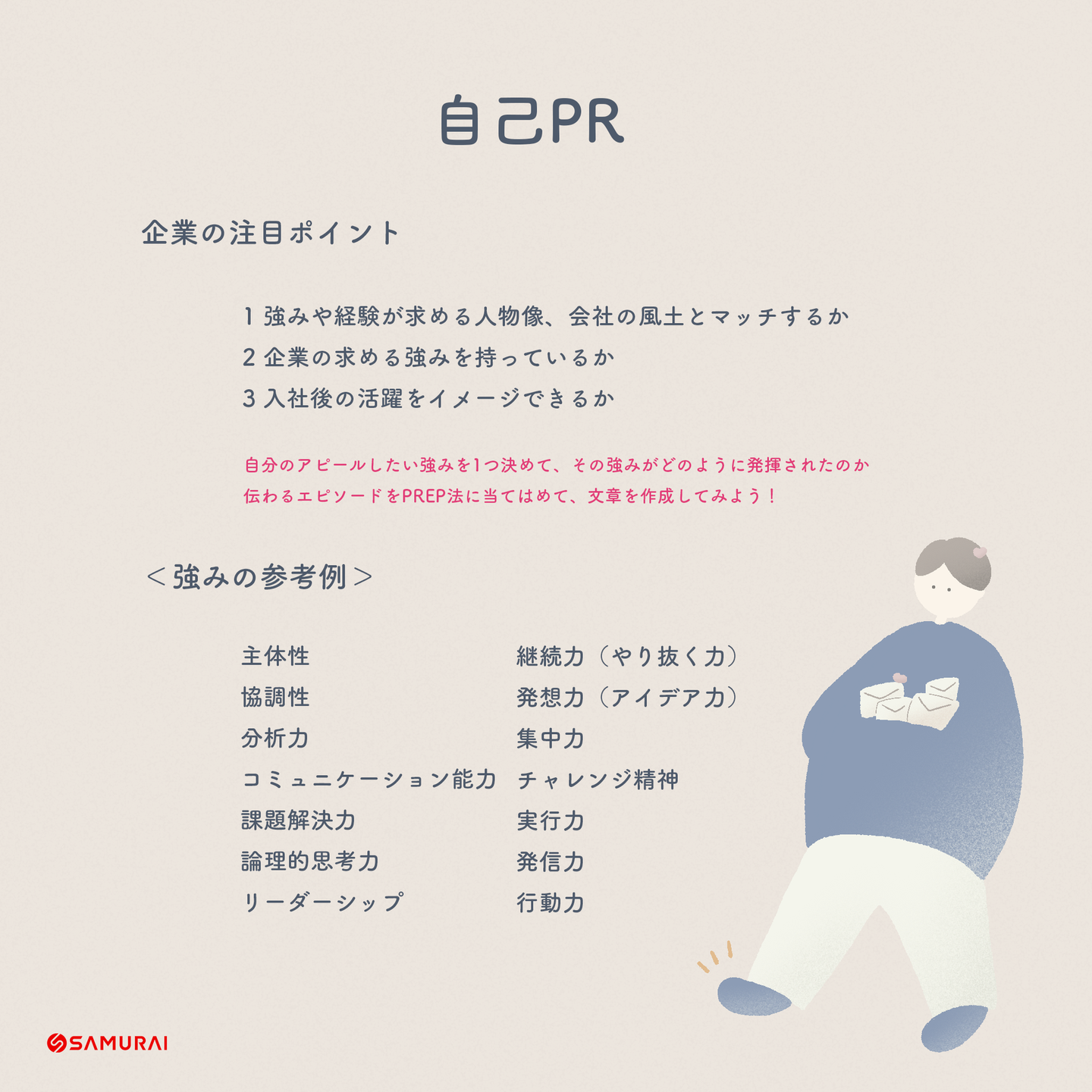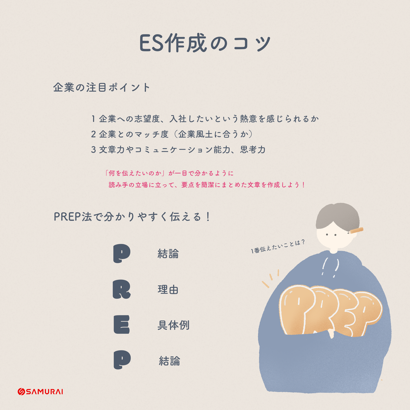 採用担当者は主に応募者の「強み」や「志望動機」に注目しています。まずは分かりやすく相手に伝える構成方法「PREP法」(結論・理由・具体例・結論)を使って作成してみましょう。