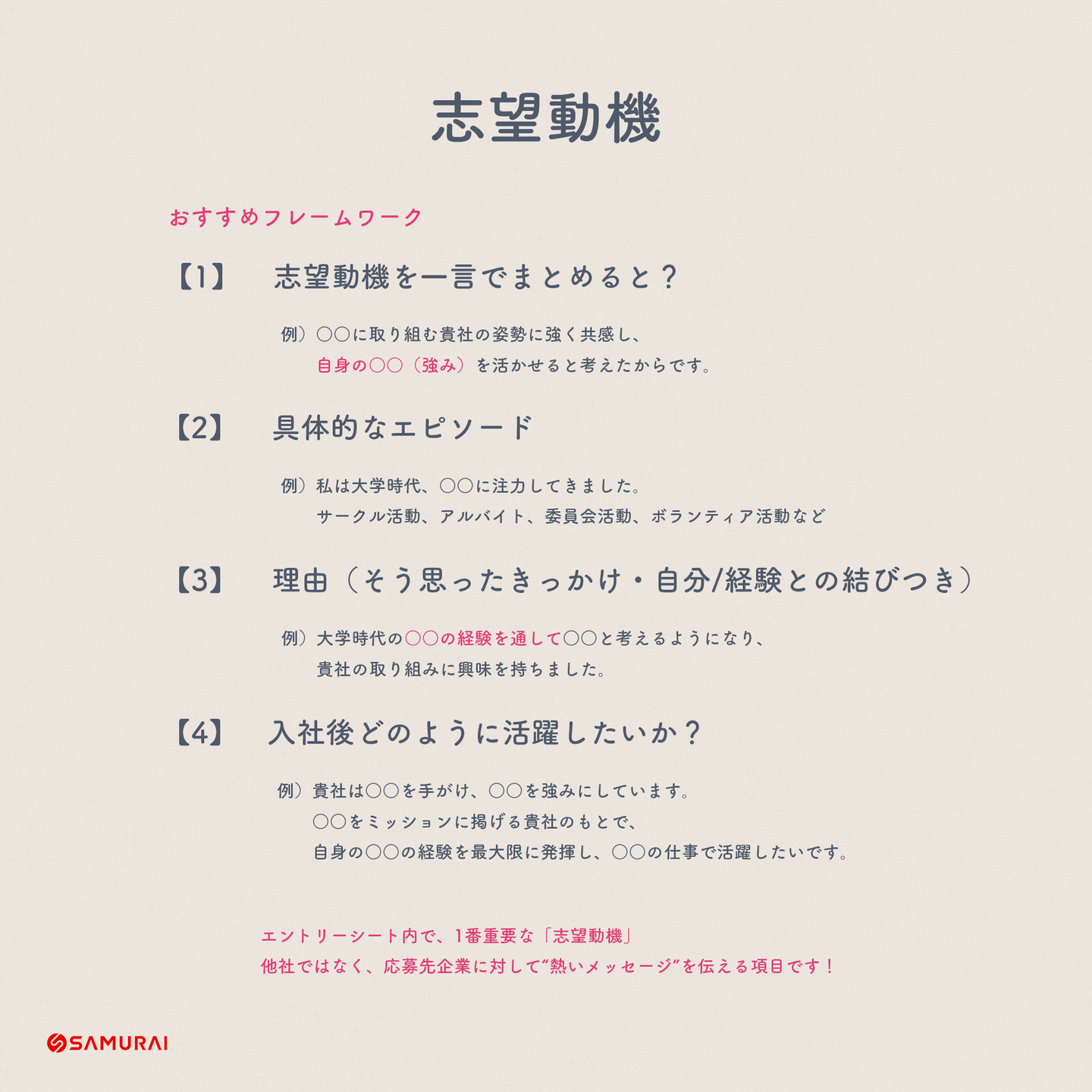 企業の事業内容やビジョンなどの解像度を上げたあとに、記入内容をブラッシュアップしていけば、より深みのある志望動機に仕上がりますよ!志望動機がなかなか完成しない…と“沼”にはまってしまった方は、フレームワークを活用してみてくださいね!
