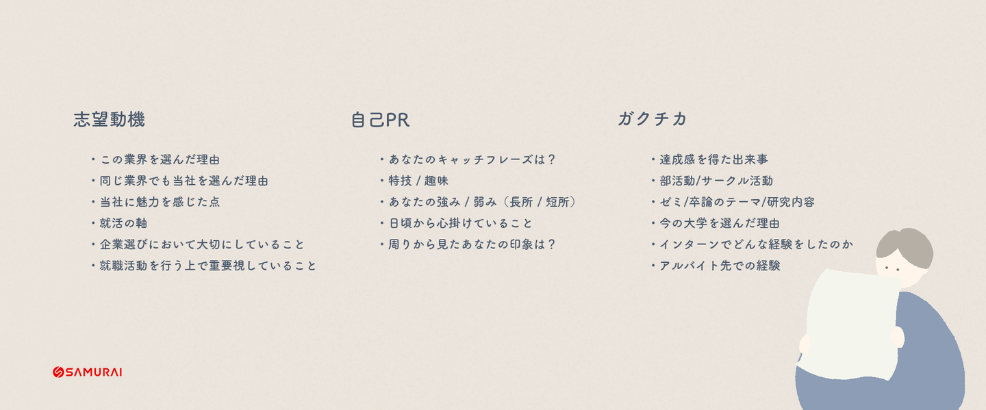 企業によって、ESの構成や提出形式は千差万別です。そのため、あらゆる角度からの質問への回答も事前に準備しておくことも重要なポイント。以下の頻出質問リストを参考にしながら、応募先企業がどんな質問を投げかけてくるのか、想像してみてください!しっかりと土台を固めておくことで、面接時の不安解消にもつながります。