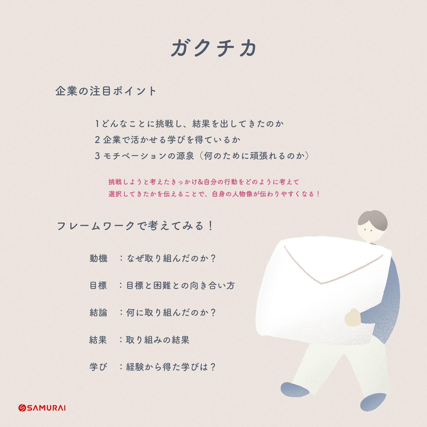 特に企業が注目するのは「学生時代の経験から、どんな学びを得たのか」。今までの経験を伝えるだけで終わらず、経験から何を得たのか、どのように成長したのか。
