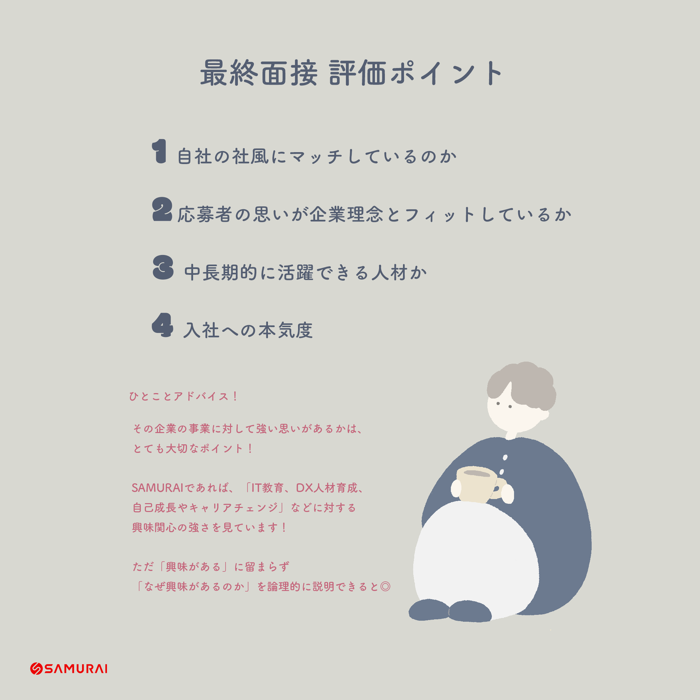 その企業の事業に対して強い思いがあるかは、とても大切なポイント!SAMURAIであれば、IT教育、DX人材育成、自己成長やキャリアチェンジなどに対する興味関心の強さを見ています。ただ「興味がある」に留まらず「なぜ興味があるのか」を論理的に説明できると◎