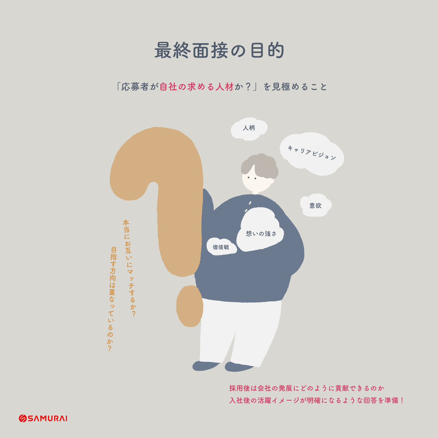 最終面接の目的は、「応募者が自社の求める人材と合っているか」を見極めること。一次・二次面接では、コミュニケーションスキルやマナー面に注目しています。