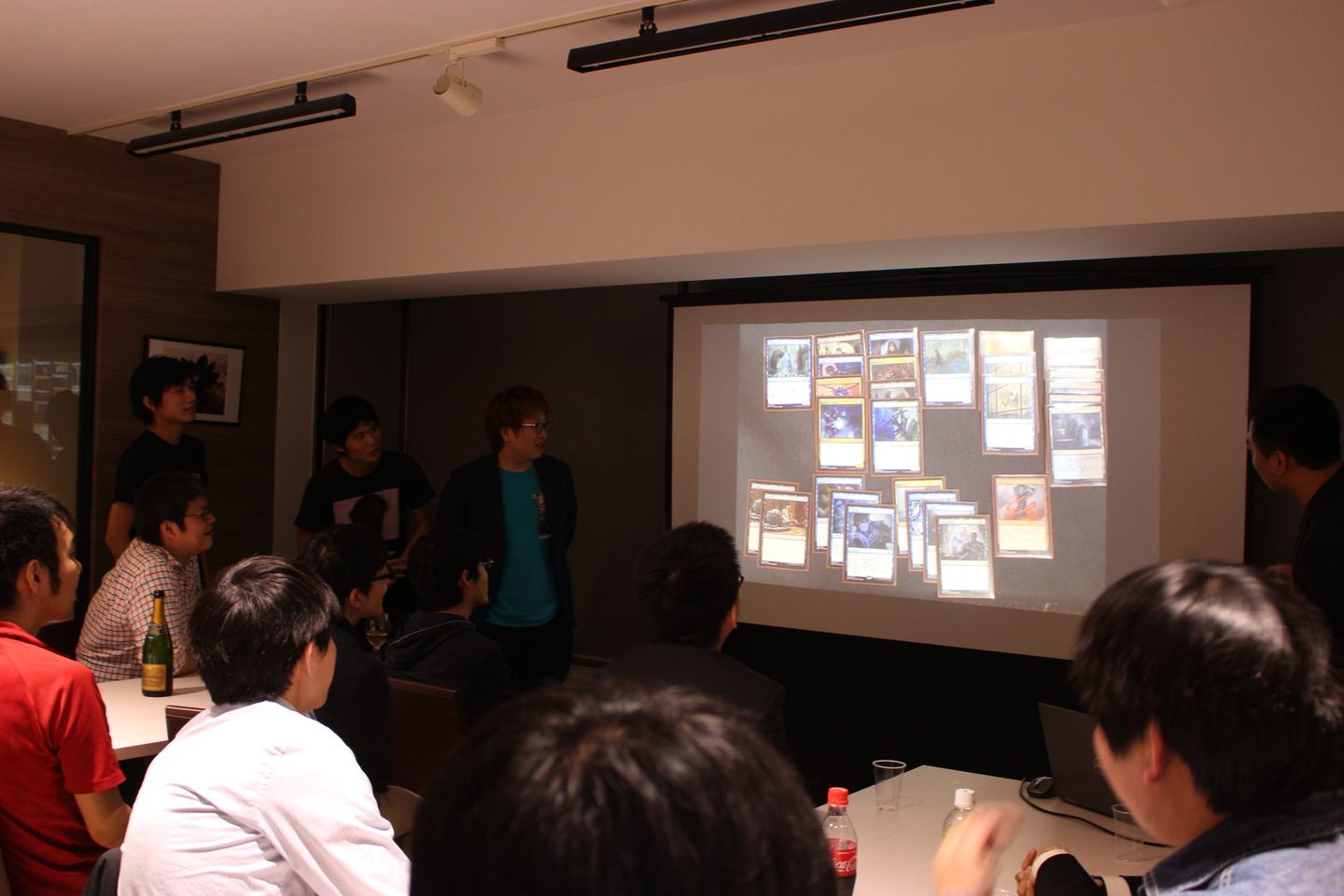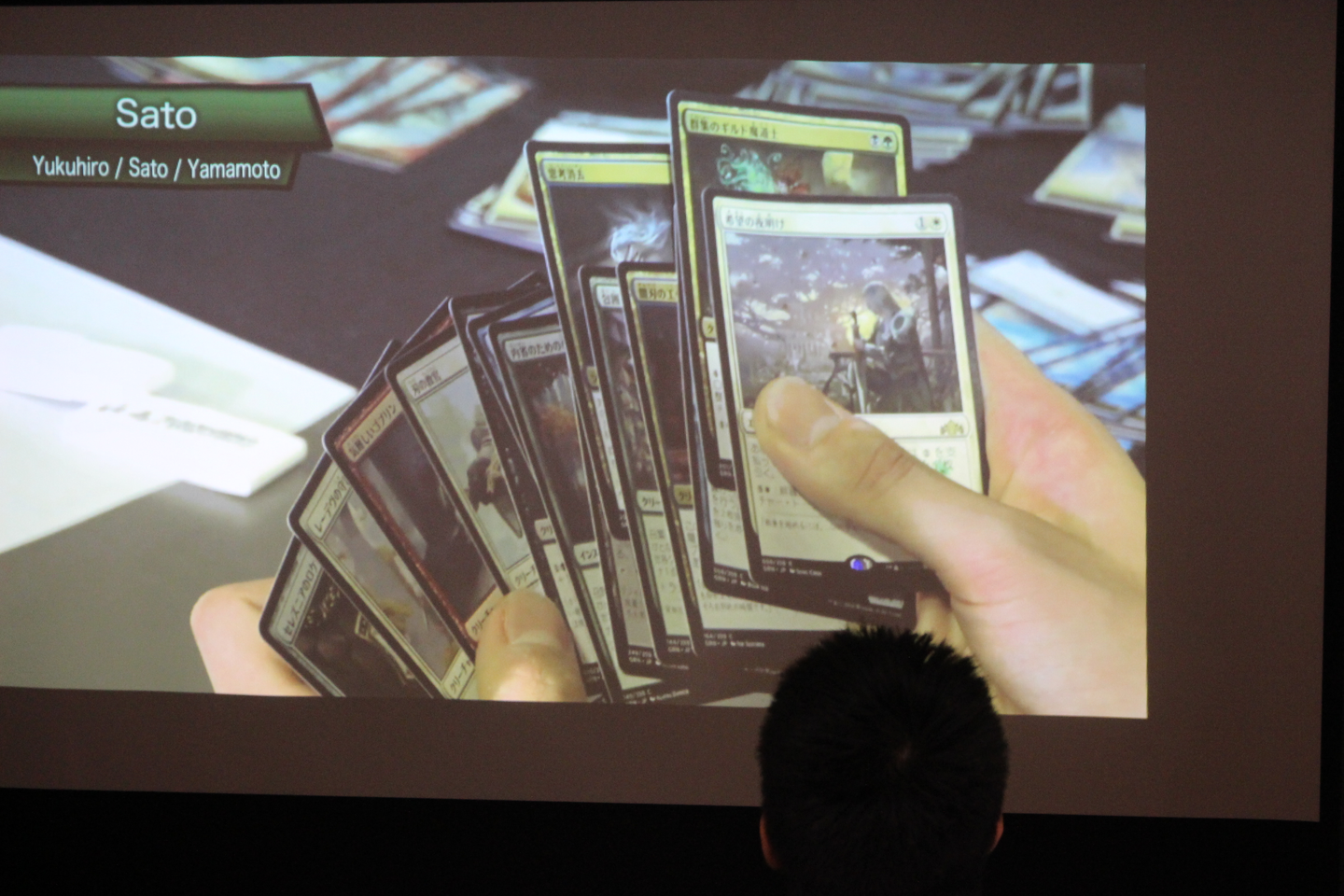 まずは本戦でどのようなシールドデッキを組んだかの解説に入ります。1日目は佐藤選手がイゼット、山本選手がディミーア、行弘選手が緑多色(白黒緑)を担当。プール自体はかなり良いものが回ってきたようで、7-1という好成績で難なく初日抜けされています。