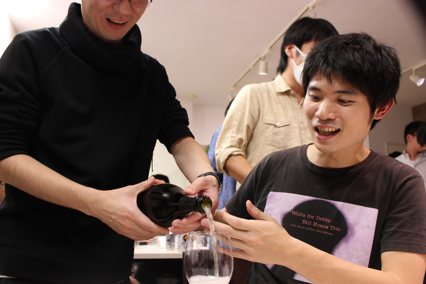 イベントはまず簡単な自己紹介、そしてシャンパンオープンからスタートします。途中司会者、というか私が行弘選手のシャンパンを誤って開封してしまう(!)というとんでもない失態をかましつつも、心の広いお三方のおかげで朗らかな空気で抜栓が行われます。
