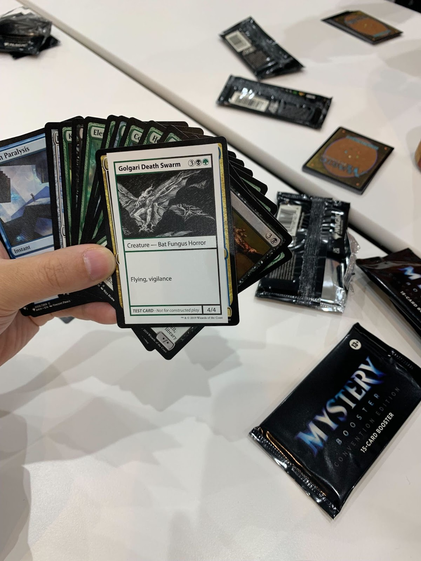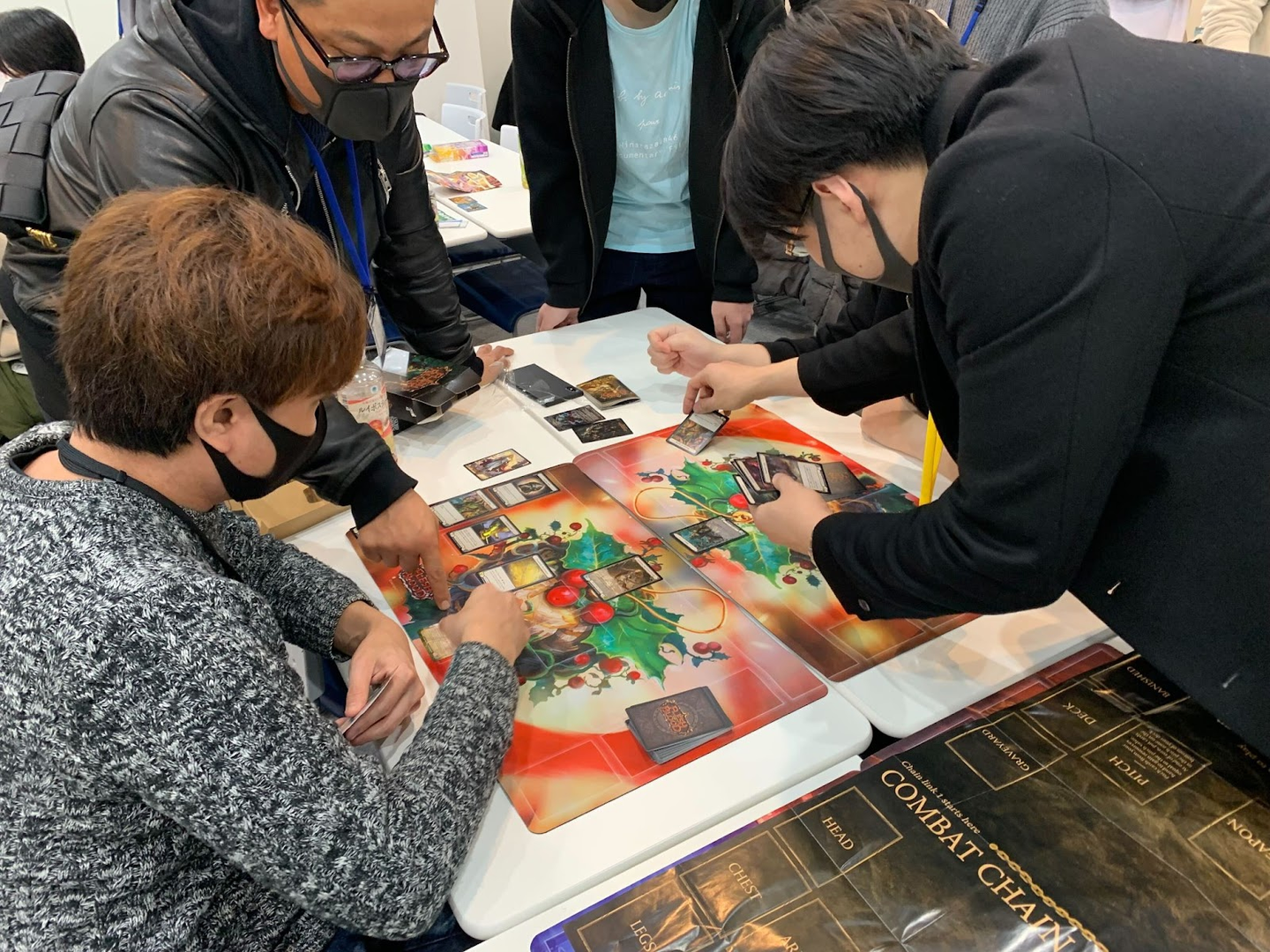 最初は皆さんルール等の把握に時間を割きつつ、1時間もしないうちに貰ったデッキで対戦が始まり、各所で盛り上がりを見せています。