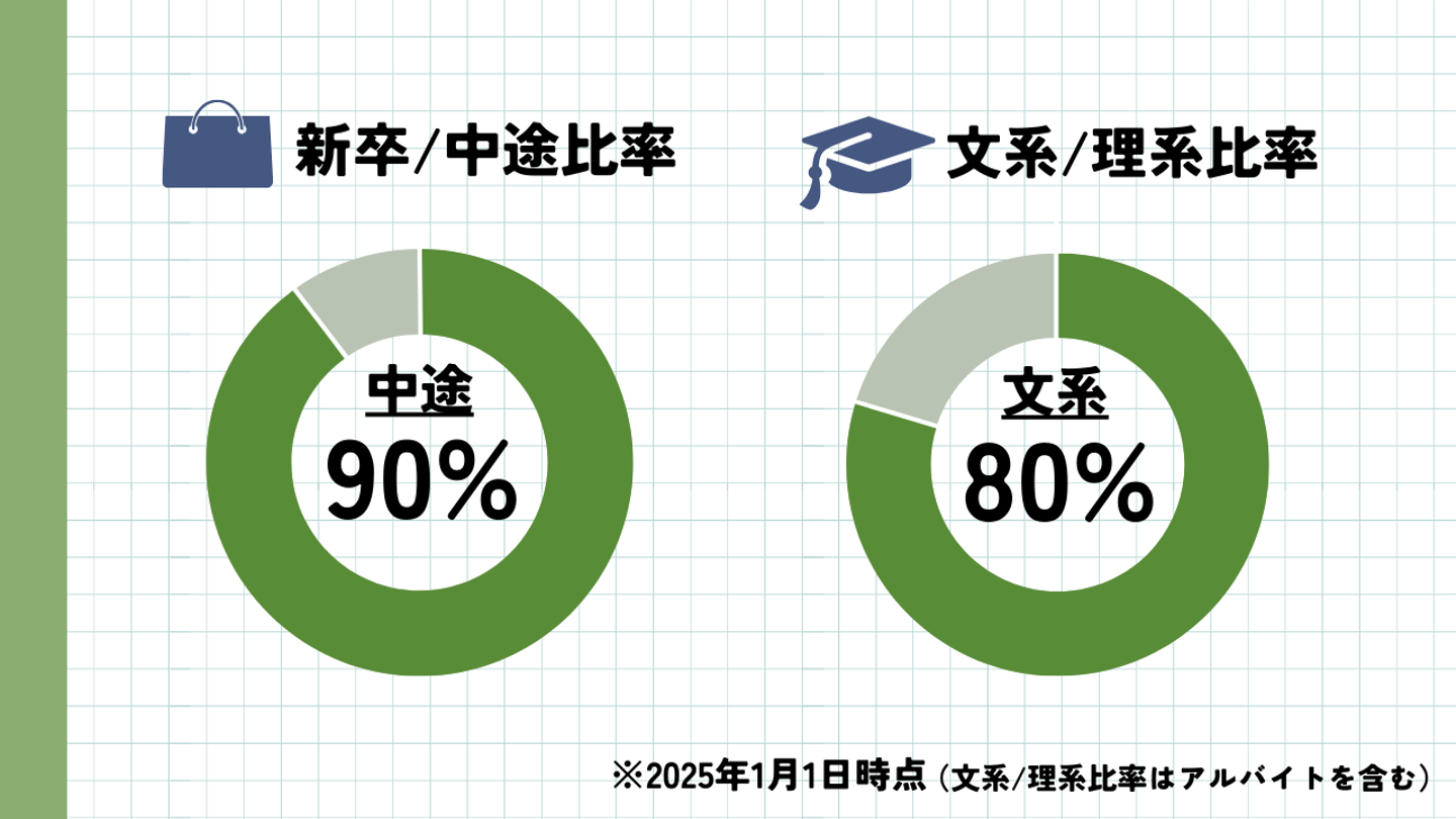 セルバは中途採用が多め。新卒採用では、2025年4月に1人エンジニア職で入社予定です。文系・理系比率では文系が8割という結果に。出身学部も経済学部、商学部、文学部、理工学部と多種多様でした。