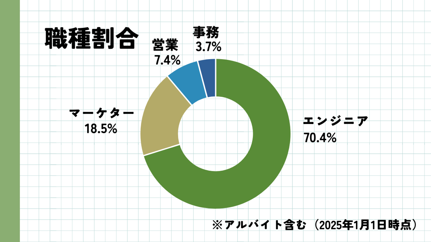 エンジニア職、営業職は基本的に正社員として勤務、マーケティング職はアルバイト(管理職のぞく)として勤務しています。社員数はそこまで多くありませんが、それは会社が「従業員1人あたりが1億円の売上を出す組織」を目指しているからです。