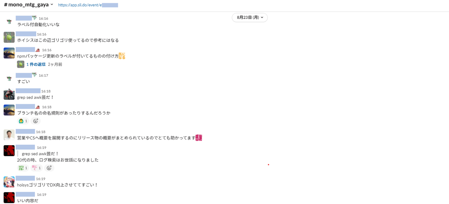 また発表中は、Slackに用意したガヤ専用チャンネルでガヤ芸人(?)と化したメンバーが盛り上げてくれています。入社してすぐは、大人しいエンジニアさんが多そうだなと感じていたのですが、LT会になるとみなさん普段よりも盛り上がりを見せていて楽しいですね。